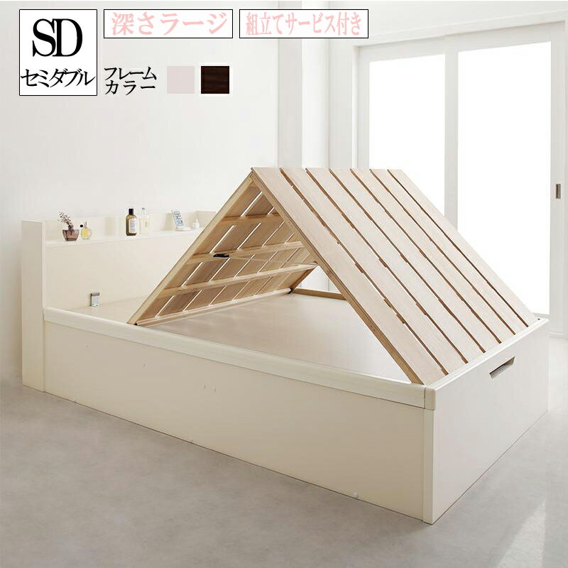 【送料無料】 組立設置サービス付き すのこ 収納 ベッド セミダブル 深さグランド フレームのみ 国産頑丈スノコ跳ね上げ式大容量収納ベッド Long force ロングフォルス 木製 棚付き 宮付き コンセント付き 布団干し ダークブラウン ホワイト