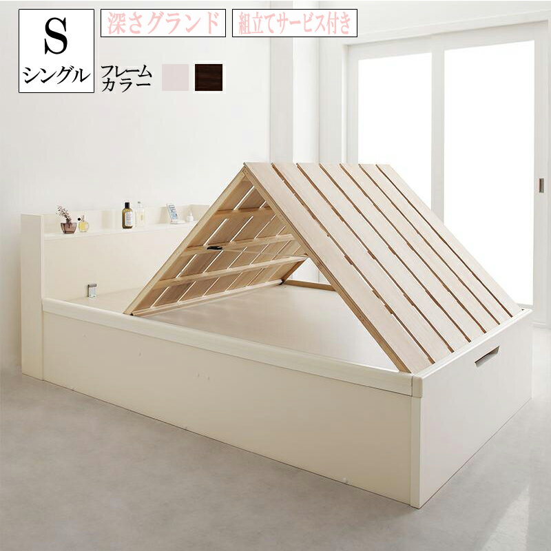 【送料無料】 組立設置サービス付き すのこ 収納 ベッド シングル 深さグランド フレームのみ 国産頑丈スノコ跳ね上げ式大容量収納ベッド Long force ロングフォルス 木製 棚付き 宮付き コンセント付き 布団干し ダークブラウン ホワイト