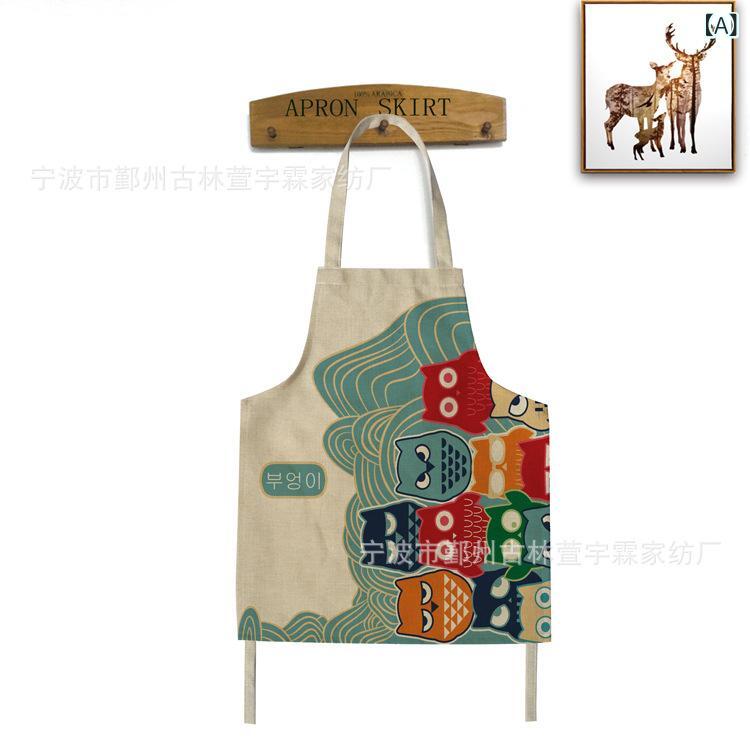 エプロン 大人用 子供用 かわいい フクロウ柄 キャラクター コットンリネン リネン ノースリーブ 家庭 キッチン 料理 ワーク カフェ 飲食店 防汚 前掛け