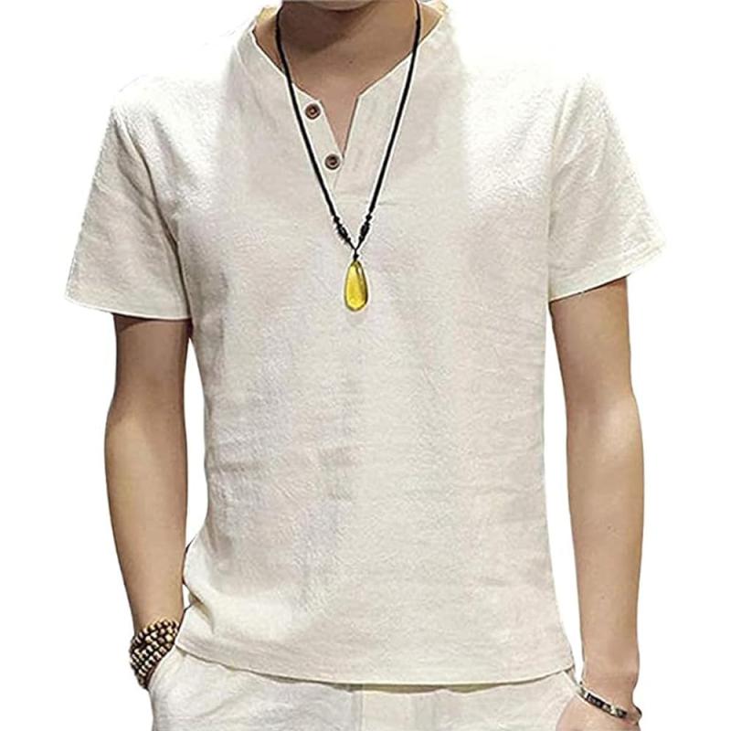 [Aaronlive] メンズ tシャツ スウェット半袖 Vネック tシャツ メンズ 綿と麻 無地 快適 大きいサイズ ストリート系 カジュアル 夏服 メンズ tシャツ
