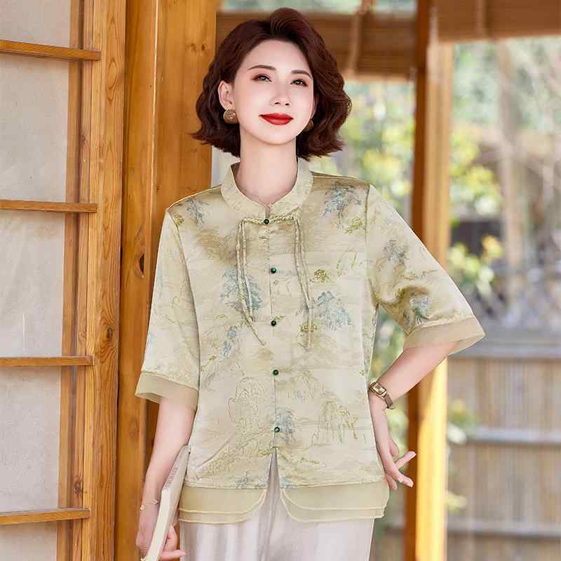 パンツスーツ シャツ ブラウス オーバーシャツ チャイナ風 母親 夏 スーツ 民族風シャツ レディース 半袖 カジュアル 通勤 休日 リゾート ママ友 お食事 デイリーユース