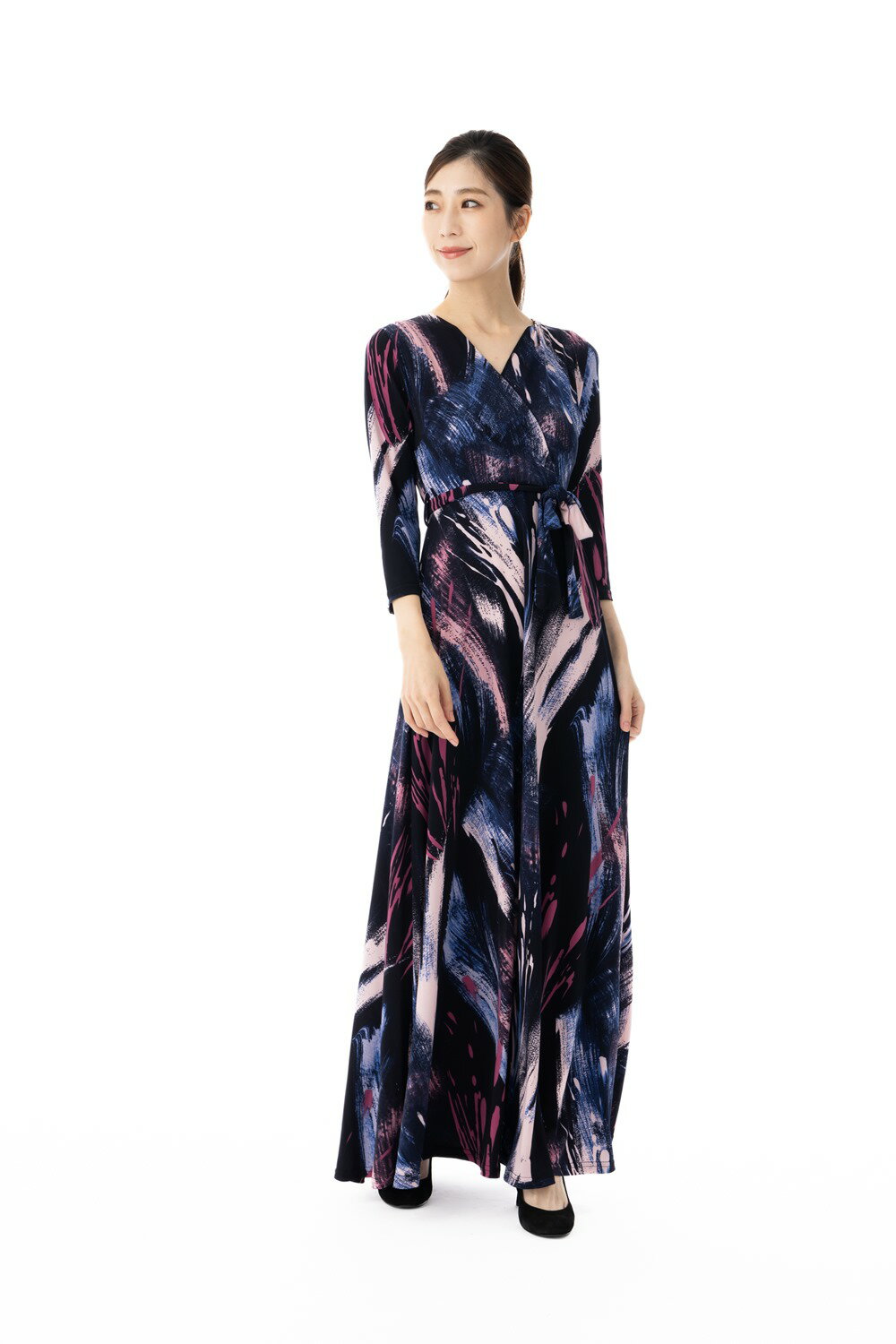 (FIFILLES)フィフィーユ カシュクールワンピース T1T2T3TU 7分袖 マキシ丈 フラワー花柄ボタニカル オフィス通勤パーティお食事会 ママ 大人レディース上品きれいめジャージーネイビー紺ホワイト白春夏秋冬コーデ(robeni320302)【おまかせ送料無料】