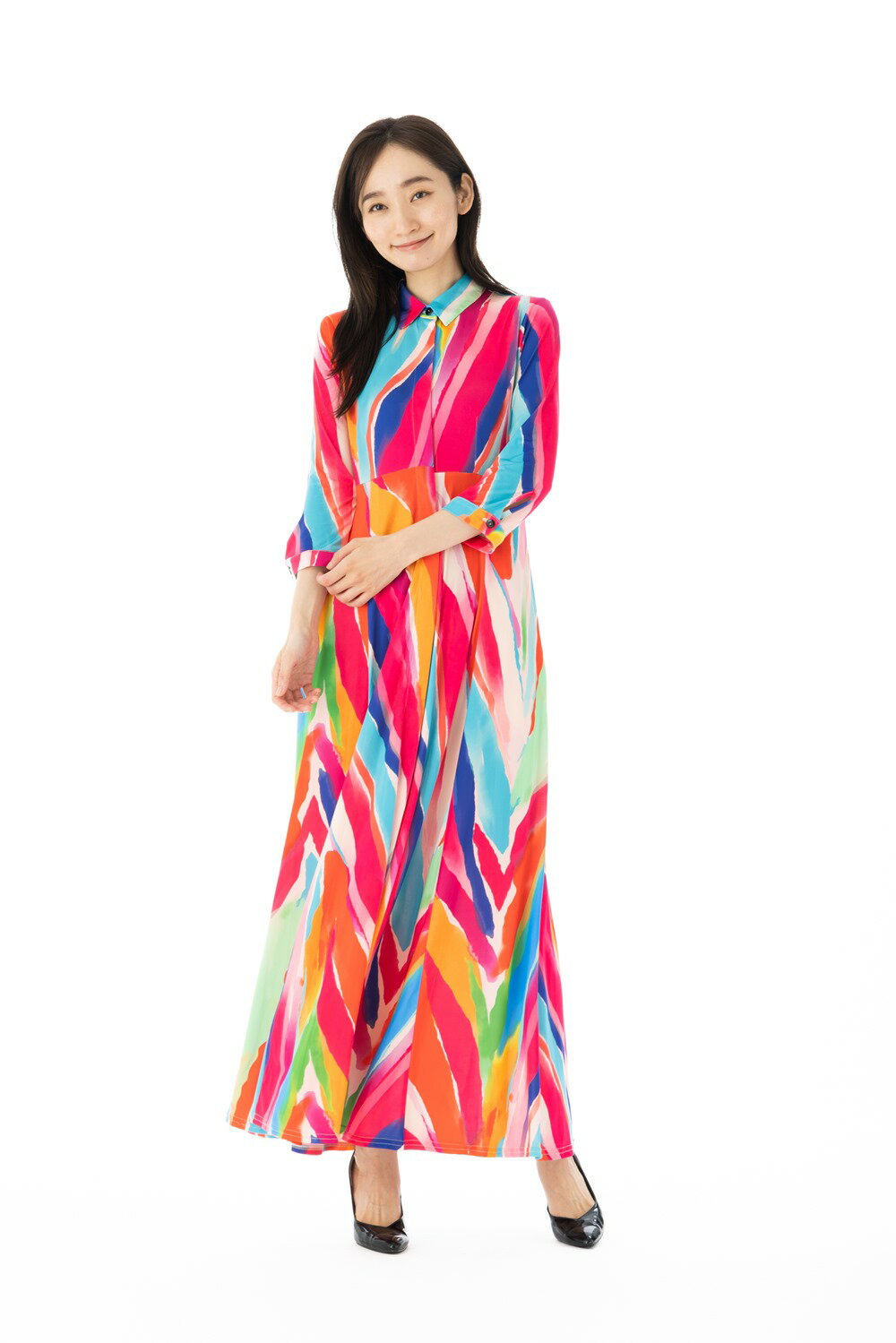 フィフィーユ FIFILLESワンピース T1 T2 T3サイズ 七分袖 ロング丈 襟 総柄 ジャージー生地 レディース 大人 着やせ きれいめ フランス製 上品 エレガント 春 夏 秋 冬 オフィス パーティ カジュアル