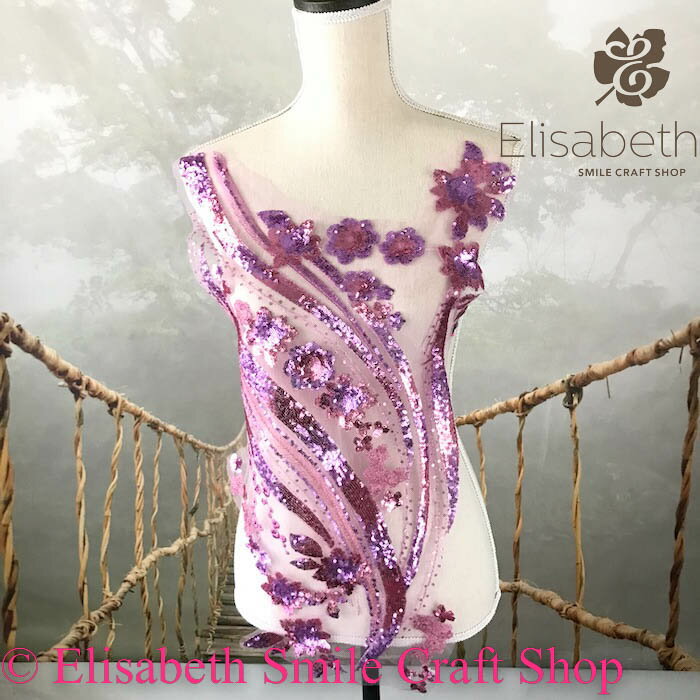 花柄とリーフ模様のパープル系のスパンコールのチュールモチーフです。 各種イベント、社交ダンス、ドレス、ステージ衣装、 舞台衣装、新体操、バトントワリング、レオタード、 演劇、ミュージカル、ベリーダンス、フィギュアスケート、 バレエ衣装、ウェディング、パーティーなど、 手作り制作など縫い付けるだけで個性的な仕上がりになります。 サイズ:H65cm W43cm カラー:パープル系 -------------------------------------------------- 刺繍とチュールの境目に 製造上に生じる針穴が何ヶ所かある場合がございます。 衣装用として遠目から見えるものではございませんが、 気になる方はご遠慮いただきますようお願いいたします。