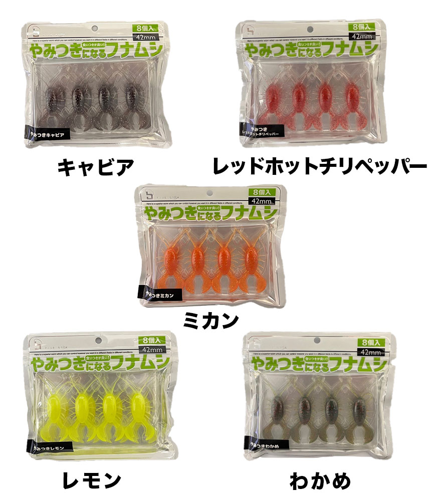 ■サイズ:約42mm ■入数:8 ■カラー:キャビア/レッドホットチリペッパー/ミカン/レモン/わかめ ●見た目はフナムシそのものなリアルソフトベイト ●チニング、ロックフィッシュに最適なワーム。底をズル引きすることで多数の細かい脚と2本の大きな脚でアピールしターゲットを魅了する動きが可能 ●水中を泳ぐ虫の姿は多くの魚種を狙う事ができ、使い方も多彩で針へのチョン掛け、オフセットフック等様々なシーンでの活躍ができる ●水中ではタダ巻きやリフト&フォールによりチヌ、ロックフィッシュ等のバイトを誘発する