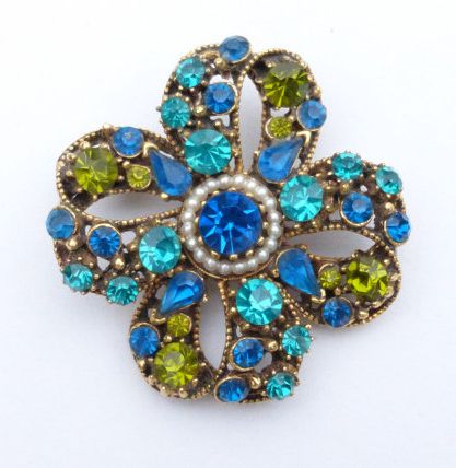 FLORENZA フロレンザ ブルーグリーン系ラインストーン リボン型ブローチ