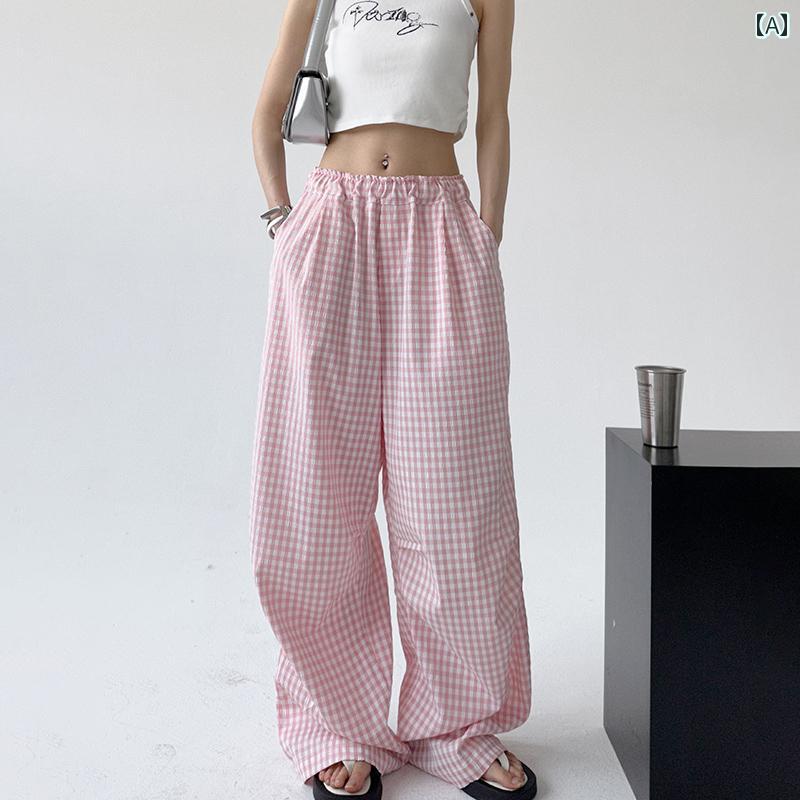 レディース カジュアル パンツ ワイド おしゃれ ストリート ダンス 女性 ピンク チェック柄 レッグ 春 韓国 ハイウエスト スリム 弾性 ウエスト フロア レングス