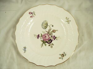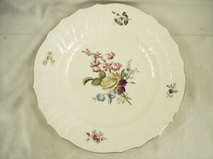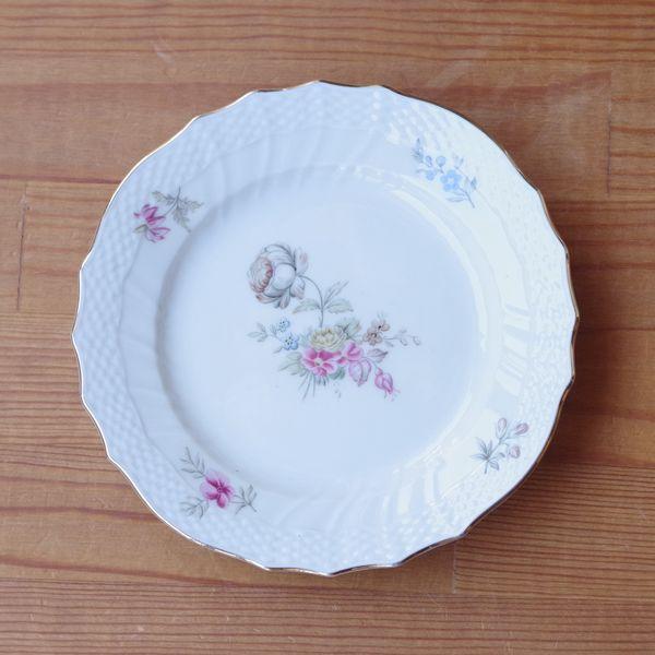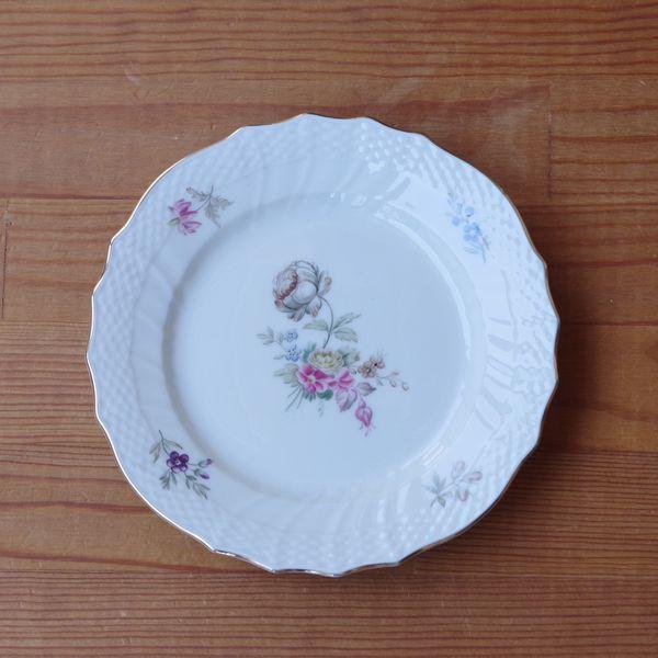 ロイヤルコペンハーゲンのデザートプレートです。 Frijsenborg というシリーズのものです。 地の陶器は真っ白ではなく、淡い象牙色で、 リム部分には籐を編みこんだようなレリーフや ドレープ状のレリーフが入っています。 いろいろな花の絵柄が入っており、ゴールドのふちどりが入っています。 1940年代ごろのものです。 状態に関して、特に目立つチップやヒビはありません。 わずかな擦り傷や色剥げはあるかと思いますが、 全体として傷は少なく、ツヤがあり、 ヴィンテージ品としてはとてもきれいな状態です。 製品本来の品質として、ちょっとした色汚れや色むら、 小さな黒点や不整形等はある場合があります。 詳細は、写真にてご判断ください。 --- ■サイズ: 直径約 15.8cm ※ 写真に写りこんだデコレーションはお届け内容に含まれません。