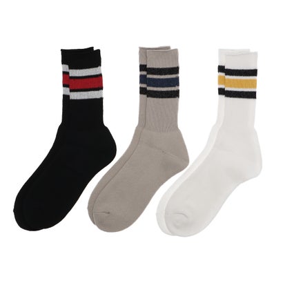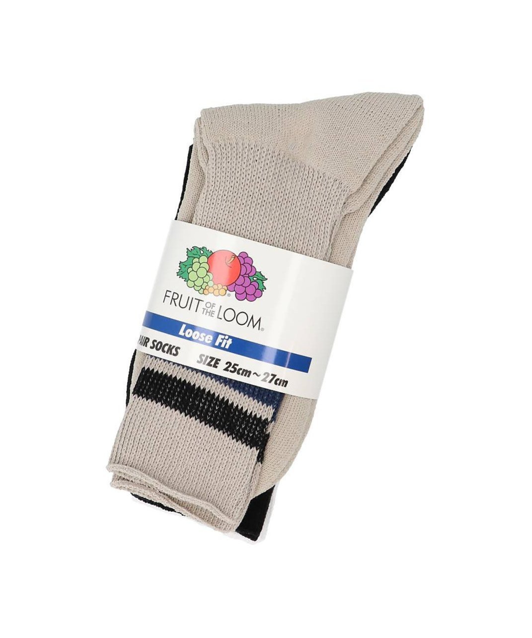 Dadスニーカーから着想を得た、ルーズフィットソックスが登場締め付けを感じない、ゆったりとした着用感が特徴。一日中履いても靴下跡が付かないほどの履き心地の良さを実現しました。リブ部分にライクラゴムを使用し、ルーズに履きこなすトレンドの履きこなしが可能。ライクラゴムとは伸縮性がある細い繊維。安価なゴムと比較し繰り返しの選択にも強く、引っ張ると通常の何倍もの伸縮性を持った機能性の高いゴムです。通常サイズよりも大きめのシルエットなので、いつものサイズとの履き心地の違いを感じられるはず。どんな場面にも使えるベーシックなお色にスポーティなラインの入ったカジュアルなデザイン。汎用性の高さが嬉しいアイテムです。スリッポンやスポーツサンダルなど、露出度の高いシューズと合わせていただくのがおススメです。お得感満載な3足セットでお財布にも◎親しい人へのちょっとしたプレゼントやギフトにもいかがでしょうか。【FRUIT OF THE LOOM/フルーツ オブ ザ ルーム】アメリカ・ケンタッキー州に本拠地を置き、アンダーウェア・プリント用Tシャツ市場でTOPブランドとしての地位を確立している160年以上の歴史を持つ世界有数のベーシックアパレル/アンダーウェアメーカー。国内でもプリントTシャツのボディやアンダーウェアのブランドとして広く知れ渡っており、Tシャツやアンダーウェア以外にもアメリカを感じる商品を幅広く展開し続けています。“LOOM”とは「織機」の意味し、「織り機の結実、達成」という意味合いがブランド名には込められています。※商品の特性上、着用された場合はご返品をお受けできませんのでご注意ください。