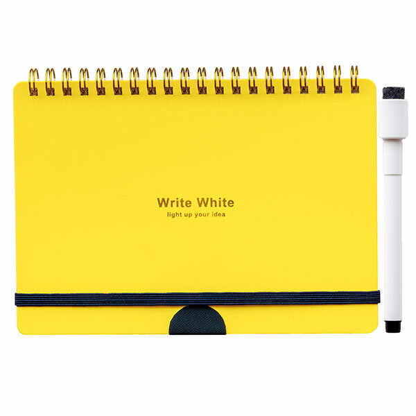 文具女子博でも話題! 持ち運びが簡単なホワイトボードノート。 テレワークでのオンライン会議や自宅学習に最適! 0.8mmの極細ペンが付いているので細かい文字の書き込みも簡単にできます。 各ページの間に筆記が可能な透明シートが付いていて、書いた文字の保護カバーやスキャンするときの保護カバーなどとしても活躍。 持ち運びやデスクの立てかけに最適なB6サイズ。 表紙にはすべり止めがついて立てかけやすくなっており、TODOリストや電話メモとして活用できます。 内容:8ページ、各ページの間に透明PPシート(4枚)、ホワイトボードマーカー 材質:本体:紙・透明PPシート、リング:鉄 本体サイズ:幅182×高さ128mm ホワイトボードマーカー:幅15×高さ125mm×Φ9mm 付属ペン:0.8mm程度 先端イレイサー付