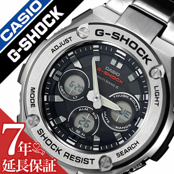 カシオ Gショック Gスチール CASIO G-SHOCK G-STEEL ソーラー アナデジ メンズ 腕時計 ブラック シルバー GST-S110D-1ACR GST-S110D-1A■ステンレス(メタル)と樹脂のハーモニー!タフなシーンからビジネスシーンまで対応の、大人な新たなシリーズG-STEEL登場!! タフネスを追求し進化を続けるG-SHOCKから、新たに「レイヤーガード構造」を採用した「G-STEEL(Gスチール)」が登場。ベゼル部に異なる素材を用いて、二層のレイヤー構造にすることにより新たな耐衝撃構造を実現。ベゼル上部にメタル(ステンレス)を使用した場合は下部に緩衝体となる樹脂、また上部に樹脂を使用した場合は下部にファインレジンを組み合わせることで、上部からの衝撃を緩衝する耐衝撃構造を新開発。これによりデザインの幅を広げました。タフソーラー機能を搭載。ワンプッシュで時分針を現在の位置から、一時的に退避させ液晶表示が読み取れる針退避機能や、文字板を明るく照らすダブルLEDライトも搭載しています。新しい構造により、タフネスデザインのバリエーションの幅を広げた、新シリーズ「Gスチール」の登場です。※こちらは国内モデルGST-W110D-1AJFから電波受信機能を省いた逆輸入海外モデルになります。■仕様 クォーツムーブメント(cal.5445) タフソーラー(ソーラー充電システム) 20気圧防水 ネオブライト 針退避機能(針が液晶表示と重なって見づらいときは、針を液晶表示の上から一時的 に避させることができます) ワールドタイム:世界48都市(31タイムゾーン、サマータイム設定機能付き)+UTC(協定世界時)の時刻表示、ホームタイムの都市入替機能 ストップウオッチ(1/100秒、60分計、スプリット付き)タイマー(セット単位:1分、最大セット:60分、1秒単位で計測)時刻アラーム5本(1本のみスヌーズ機能付き)・時報 フルオートカレンダー バッテリーインジケーター表示 パワーセービング機能(暗所では一定時間が経過すると表示を消して節電します) 12/24時間制表示切替 操作音ON/OFF切替機能 ダブルLEDライト 文字板用LEDライト(フルオートライト、残照機能、残照時間切替(1.5秒/3秒)付き)、LCD部用LEDバックライト(フルオートライト、残照機能、残照時間切替(1.5秒/3秒)付き ) 精度:平均月差±15秒 ※フル充電時からソーラー発電無しの状態での駆動時間機能使用の場合:約7ヶ月 パワーセービング状態の場合:約18ヶ月 サイズ ケース:約59.1×52.4×16.1mm 風防:直径約36mm 腕周り:最大約20.5cm 重量:約190g 素材 ケース・ベゼル:ウレタン樹脂+ステンレススティール ベルト:ステンレススティール(ワンプッシュ三つ折れ式中留) 風防:ミネラルクリスタル 付属品 カシオオリジナルボックス 日本語取扱説明書(5445のコピー) 当店1年間保証 2016*4月新入荷 【G-STEEL-102015】【Analog-and-Digital-model-102015】1983年、カシオ計算機より「壊れない腕時計」としてG-SHOCK誕生。外殻から独立した内部機構とポリウレタン樹脂製の衝撃吸収材等によりアイスホッケーのパック代わりにしても壊れないほどの頑丈さを誇る。戦争に派遣される軍人たちにも愛用され、『スピード』をはじめとする多数のアクション・戦争映画にも脇役として出演。多機能、高気圧防水、他に気圧計や水深測定器、電波時計、太陽電池等様々な先端技術を盛り込んだ製品が多数発売されているハイテクウォッチキャラクターや著名人とのコラボレーションで高い人気を誇る。CASIO G-SHOCK カシオ Gショック G-STEEL Gスチール 逆輸入海外モデル ソーラー アナデジ 腕時計 ブラック シルバー GST-S110D-1ACR GST-S110D-1A ステンレス(メタル)と樹脂のハーモニー! タフなシーンからビジネスシーンまで対応の、 大人な新たなシリーズG-STEEL登場!! タフネスを追求し進化を続けるG-SHOCKから、新たに「レイヤーガード構造」を採用した「G-STEEL(Gスチール)」が登場。 ベゼル部に異なる素材を用いて、二層のレイヤー構造にすることにより新たな耐衝撃構造を実現。ベゼル上部にメタル(ステンレス)を使用した場合は下部に緩衝体となる樹脂、また上部に樹脂を使用した場合は下部にファインレジンを組み合わせることで、上部からの衝撃を緩衝する耐衝撃構造を新開発。これによりデザインの幅を広げました。タフソーラー機能を搭載。ワンプッシュで時分針を現在の位置から、一時的に退避させ液晶表示が読み取れる針退避機能や、文字板を明るく照らすダブルLEDライトも搭載しています。新しい構造により、タフネスデザインのバリエーションの幅を広げた、新シリーズ「Gスチール」の登場です。 ※こちらは国内モデルGST-W110D-1AJFから電波受信機能を省いた逆輸入海外モデルになります。 仕 様 クォーツムーブメント(cal.5445) タフソーラー(ソーラー充電システム) 20気圧防水 ネオブライト 針退避機能(針が液晶表示と重なって見づらいときは、針を液晶表示の上から一時的 に避させることができます) ワールドタイム:世界48都市 (31タイムゾーン、サマータイム設定機能付き)+UTC(協定世界時)の時刻表示、 ホームタイムの都市入替機能 ストップウオッチ(1/100秒、60分