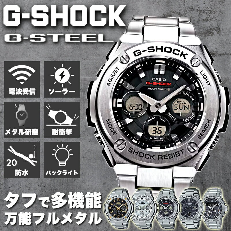 カシオ Gショック[CASIO G-SHOCK]G-SHOCKが誇るタフの象徴、耐衝撃構造。モジュールを宙に浮かせるように包み込む中空構造のケース、落下衝撃からモジュールを守る全方向カバリング、そして、基盤に配合した重要部品の緩衝材による保護。すべては、絶対に壊れない時計をつくるという、当時の常識を覆す発想から生まれた。G-SHOCK、その挑戦に終わりはない。G-SHOCKの特徴の一つに、多様な機能を持っている点が挙げられる。具体的にはストップウォッチやタイマー機能、アラーム機能の他、製品によっては高気圧防水、防塵、防泥、気圧計、水深測定器、温度計、電波時計、太陽電池、超硬質コーティングなどが採用されています。[ 商品ポイント ]もっと便利に、もっと使いやすく”壊れないG-SHOCK”のオールメタルモデルです。電波ソーラー機能でいつでもどこでも使いやすい安心の1本。正しい時刻をキープ_電波ソーラー機能世界6局の電波を受信し、どこにいても正しい時刻を表示する「MULTIBAND6」機能を搭載。いつでもどこでも正確な時間を刻みます。電池切れの心配から解放する_ソーラー充電機能着けることをもっと楽しく。ソーラー充電機能も搭載しており、着けているだけで電池切れの心配がありません。情報をもっと見やすくかっこよく日付・曜日・秒を「反転液晶パネル」で表示。暗い場所でもすぐに情報を確認できます。高い機能性とデザイン性を両立しました。タフネスを強化した「レイヤーガード構造」ベゼル部に異なる素材を用いて、二層のレイヤー構造にすることで耐衝撃性能をさらに強化しています。安心の20気圧防水突然の雨や湿気、アクティビティでの水没から時計を守る防水性能を誇ります。メタルの質感を引き出す特別な研磨鏡面仕上げ、ザラツ研磨やヘアライン加工を施し、滑らかで美しく仕上げています。使えば使うほど愛着が増すアイテムです。便利機能も複数搭載仕事や勉強でも使いやすいストップウォッチ、タイマー、アラーム、LEDバックライトを搭載。操作音もオンオフ切り替えができて商談や試験でも安心して使用できます。G-SHOCKらしいビッグケースメカニカルなビッグケースは迫力があり、身に付けるだけで男らしく魅せられます。小型モデルもラインナップNo.4.5.6は小型化したことで装着性を増したモデルです。腕が細い方やコンパクトなモデルをお探しの方におすすめです。これ1本で仕事もプライベートも解決できる、カシオのベストセラーシリーズ素材にメタルを使用したことで従来のG-SHOCKをよりシャープな印象に仕上げています。型番2025/9/11 ラインナップ追加しました。GST-W110D-1AJFGST-W110D-1A9JFGST-W110D-7AJFGST-W310D-1AJFGST-B400D-1AJFGST-B200D-1AJFシリーズG-SHOCK ジーショックケース材質【No.1〜No.5】樹脂/ステンレススチール【No.6】カーボンファイバー強化樹脂/ステンレススチールケース径【No.1〜No.3】 59.1 × 52.4mm(縦×横)【No.4】55.9 × 49.3mm(縦×横)【No.5】46.6 × 49.6mm(縦×横)【No.6】53.3 × 46.5mm(縦×横)ケース厚さ【No.1~No.3】16.1mm【No.4】15.3mm【No.5】12.9mm【No.6】14.5mm腕回り約15~20cm重さ【No.1~No.3】約195g【No.4】約183g【No.5】約160g【No.6】約177gケース/ベルトカラーシルバー 機能ストップウオッチ時刻アラーム5本タイマーダブルLEDライトフルオートカレンダーバッテリーインジケーター表示12/24時間制表示切替タフソーラー耐衝撃構造(ショックレジスト)【No.1〜No.4】電波受信(日本・北米・ヨーロッパ・中国地域対応 MULTIBAND6)【No.5〜No.6】Bluetoothモバイルリンク機能(自動時刻修正 簡単時計設定 ワールドタイム約300都市 タイム&プレイス リマインダー 携帯電話探索)ムーブメントタフソーラー(ソーラー充電システム)風防素材無機ガラス防水性20気圧防水付属品カシオ純正BOX保証書※SDGs(環境問題)への取り組みの一環として、紙の説明書が付属しないブランドがございます。予めご了承くださいませ。この商品のお問い合わせ番号WLR-item-51226メーカー希望小売価格はメーカーサイトに基づいて掲載しています 楽天スーパーSALE スーパーセール SUPERSALE