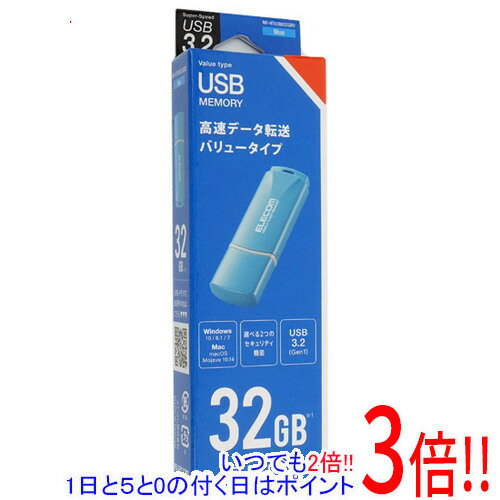 【いつでも2倍!1日と5.0のつく日、18日は3倍!】ELECOM キャップ式USB3.2 Gen1メモリ MF-HTU3B032GBU 32GB ブルー