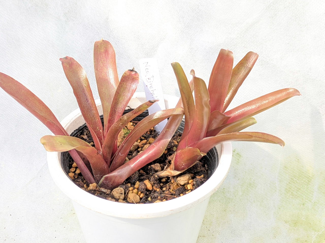 置き場所 朝の最低気温が13度ぐらいを毎日下回る季節には出来るだけ暖かい温室または出来るだけ日の当たる暖かい室内。春、夏、秋の暖かい季節には野外の軒下やフェンス、木陰に吊るして下さい。 水やりについて 現地では樹木に着生しています。水分を追いかけて地面に深く生え込む植物ではないので乾燥には強いので用土が十分乾いたら葉の間にも水が溜まるようにあげてください。冬季、温度が不足気味の管理で越冬する場合には水は控え目にして、あげる時は天気の良い暖かい午前中にかけます。 温度、湿度について 湿度はそれほど神経質に考える必要は無いと思いますが、エアコンの乾燥した風が吹きつけないようにしてください。温度は夏の気候を出来るだけ再現する事が望ましいですが、朝方の最低気温は10度以上は確保してください。 肥料について 肥料には反応しますので油粕やマグアンプを根圏に置きます。春から秋口までの間に2,3回鉢植え観葉植物に挙げる程度の量 注意 以上、ネオレゲリアの栽培についての基本的なポイントについて説明しましたが、あくまでも、指標であって生育を保証するものでは有りませんのでご理解のほど宜しくお願い致します。10/18更新Neoregelia 'fireball' 商品画像が現物です 下の商品説明はリオオブリオですが、ほとんど同じ雰囲気になります。 ファイヤーボールの方が若干小さい雰囲気になります。 短めのリードを伸ばして空中コロニーを作ります。日当たりの良いところで栽培すると赤く色づきます。 次々にリードを伸ばして大きなボール状になります。 水やりはこまめにあげる必要はありません。用土が十分乾いた頃に鉢にかけると同時に、葉の間にも水が溜まるようにシャワー潅水します。ネオレゲリアはこのように葉に水を溜めて乾季に備えます。 根元から新しいリードを伸ばして子株を作ります。こんな花も咲きます。 冬季は室内で育ててください。