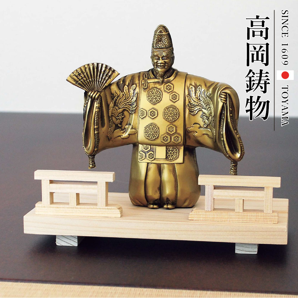 【商品番号】912egn-093-gsg 翁は能の演目のひとつで、老体の神による祝福の舞です。正月や神聖なハレの催しといったおめでた席で演じられます。檜舞台の翁は手に吉祥の扇を持ち、「とうどうたらり」と千代の幸せを祈る祝言を謡います。平穏無事、五穀豊穣などを祈祷する大変縁起の良い物です。鳳凰や亀甲紋など、縁起の良い柄を精巧に表現。天然ひのき材専用木台付属。能の「檜舞台」にこだわり、天然の檜材を用いています。【商品仕様】商品サイズ:本体:W120×D50×H130mm木台:W180×D90×H55mm重さ:本体1300g木台130g材質:亜鉛合金、木製