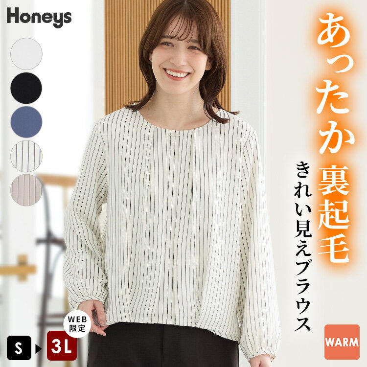 ★★最大2000円OFFクーポン配布中★★トップス ブラウス 長袖 ハニぽか あったか 大きいサイズ オフィス きれいめ 無地 ストライプ柄 レディース Honeys ハニーズ あったか裏地裾タックブラウス