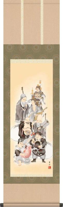 掛け軸 掛軸 緒方葉水・七福神 尺三 縁起画 床の間本紙 : 新絹本(特殊印刷 + 手彩色)サイズ: 幅44.5 x 160cm(尺三)表装 : 洛彩緞子本表装収納箱: 化粧箱収納表装品質+年間付き