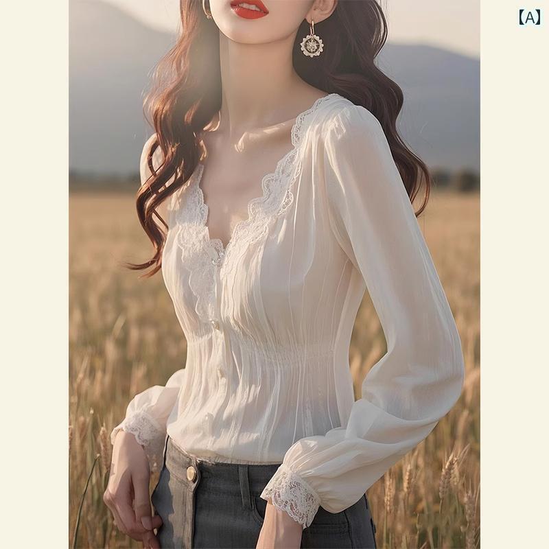 レディース シャツ レース フランス製 ホワイト レース Vネック シャツ 女性用 2025 春 軽い 高級 ハイエンドの ユニークな ファッション