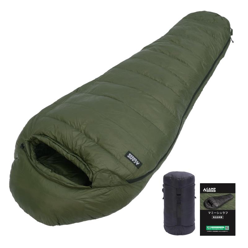 キャンプグリーブ 【国内ブランド】 ダウンシュラフ 秋冬春用 寝袋 ダウン マミー型 【高級グースダウン】【YKKファスナー】 羽毛寝袋 ダウン充填 800g コンパクト 600FP高級ダウン 400T20D撥水