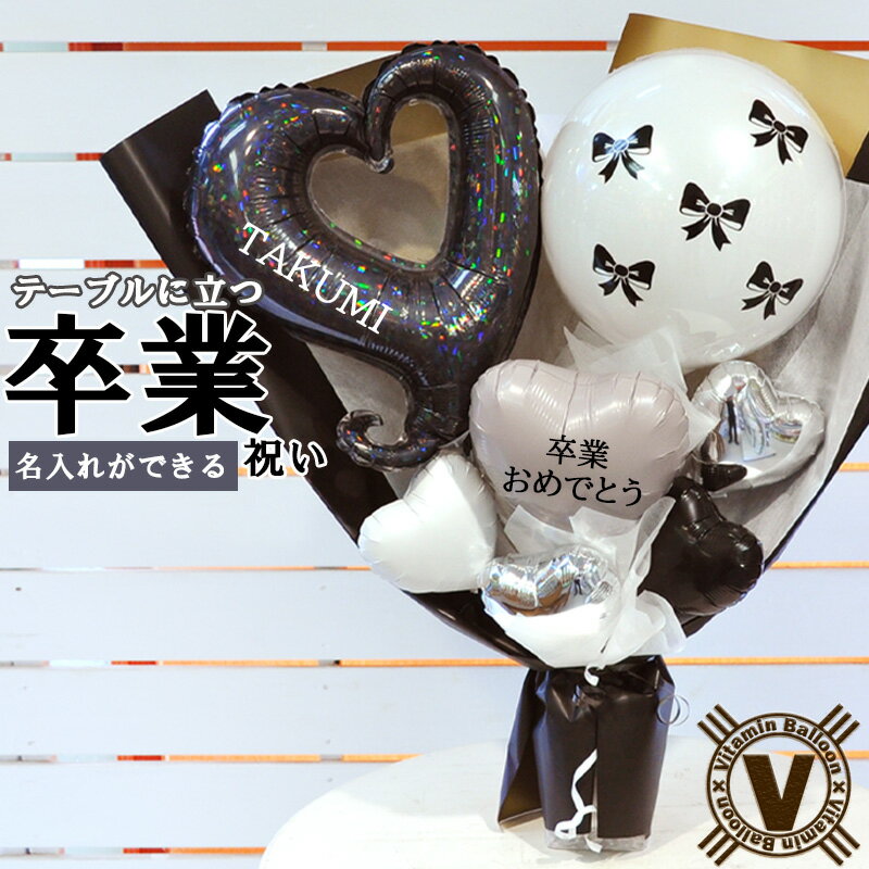 卒業祝い・送別会に|名入れ無料の自立型バルーン花束(ブラックタイプ) 卒業という人生の大切な節目を、落ち着いた雰囲気で上品に祝えるバルーン花束。 オープンハートバルーンと、言葉が選べる中央バルーンを組み合わせた、 花束タイプなのにテーブルで自立する特別な卒業祝いギフトです。 卒業式当日の贈呈はもちろん、記念写真の撮影や、 お部屋・受付・ロビーにも自然になじみ、大人っぽく飾れるデザインです。 ※空気注入式(非浮遊タイプ)/完成品でお届け。 ※送料無料(※一部地域除く) 【特徴】 ・卒業祝いに人気のバルーン花束タイプ ・花束なのにテーブルで自立する便利な構造 ・オープンハートバルーンに名入れ無料 ・中央バルーンの文字は自由に選択可能 (祝 卒業/Congrats!/おめでとう など) ・ブラック基調の甘くなりすぎないシックなデザイン ・完成品でお届け/空気タイプ(非浮遊・ヘリウム不要) ・サイズ:横 約45cm × 縦 約55cm 【名入れ・文字入れ対応(無料)】 オープンハートのバルーンに、お名前・学校名・メッセージをお入れできます。 中央の丸バルーンは、用途に合わせて文字内容の変更が可能です。 ご注文時の名入れ記入欄に内容をご入力ください。 ※文字数目安:20文字以内 ※フォント・配置は全体バランスを見て当店にて調整いたします。 ※誤字脱字・漢字の間違いにご注意ください。 【おすすめポイント】 ・卒業式当日にそのまま渡せる完成品ギフト ・自立するため、写真撮影・受付・お部屋飾りにも最適 ・名入れ対応で世界にひとつの卒業祝いに ・花と違い枯れず、思い出として長く飾れます ・学生さんだけでなく、先生・大人の方への贈り物にもおすすめ 【おすすめ用途】 卒業祝い/卒業式当日ギフト/送別会/退職祝い/ 先生への贈り物/サプライズギフト/記念撮影 ■ こんな方におすすめ ・卒業式にそのまま渡せる、落ち着いた雰囲気のギフトを探している方 ・花束以外で、記念に残る贈り物を選びたい方 ・名入れで感謝やお祝いの気持ちを伝えたい方 ・甘くなりすぎない卒業祝いを贈りたい方 【ご注文の注意】 ・ご使用日の3日前までのご注文をおすすめします ・名入れ・文字内容は名入れ記入欄をご利用ください ・正午までのご注文で即日発送可(条件あり) ・郵便番号・住所の誤入力にご注意ください ・金額のわかる明細は同梱しません 【メッセージカードについて】 無料でお付けします。備考欄にメッセージをご記入ください。 自由文・定型文どちらでもOKです。 > メッセージ例はこちら 【お届け状態】 完成したバルーン花束を透明フィルムでラッピングしてお届けします。 箱から出してそのまま飾れます。 ラッピングは外さない方が長持ちします。 ※一部バルーン・リボン等が変更になる場合がありますが、全体の雰囲気は変わりません。 【発送前の様子が見られます】 お届け前の実際の仕上がり写真をご確認いただけます。 名入れ内容や全体バランスを事前に確認できるため、ギフト発送でも安心です。 > 発送前の様子を見る 卒業という大切な門出を、落ち着いた特別感で祝えるブラックタイプのバルーン花束です。 お受け取り後のご感想やお写真レビューもぜひお寄せください。 > その他の退職・卒業祝いバルーンはこちら > その他の入園・入学・卒業はこちら > ビタミンバルーン TOPページはこちら卒業という特別な門出に、想いをスマートに届ける花束を。HORIZON(門出)BLACKハートバルーンブーケは、落ち着いたモノトーンカラーで仕上げた名入れ対応のバルーン花束。花束タイプでありながらテーブルに自立するため、卒業式当日の贈呈はもちろん、記念写真・お部屋・受付装飾にもそのまま飾れます。甘くなりすぎないデザインで、男女問わず贈りやすく、枯れないバルーンだからこそ思い出として長く残る卒業祝いギフトです。サイズラッピングペーパーでラッピングした状態での納品となります。メッセージカードメッセージカードを付けることができます。・メッセージカードの内容記入は備考欄をご利用ください。・メッセージ内容は自由文(文字数制限なし)かもしくは文章例の選択も可能です。・誤字脱字には十分ご注意ください。メッセージカード文章例スタッフ感想卒業祝いのバルーン花束ができました。オープンハートバルーンには名入れができます。そして卒業のお祝いの言葉のバルーンも選ぶことができます。この二つの嬉しい追加が特別な卒業祝いにしてくれますよ。花束タイプなのにテーブルで立つのも嬉しい特徴ですね。■サポート一覧卒業は、人生の中でも特別な節目のひとつ。「おめでとう」「ありがとう」の想いを、大人っぽく洗練されたバルーン花束で届けてみませんか。名入れ無料・完成品でそのまま渡せる安心仕様。 卒業式当日はもちろん、その後も空間に自然となじみ、思い出として飾れる特別な贈り物です。甘くなりすぎないブラックデザインだからこそ、大切な門出の日に自信を持って選べる一品です。