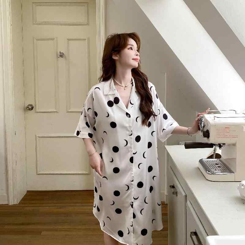 パジャマ レディース ルームウェア シャツ ワンピース 接触冷感 部屋着 涼しい 寝巻き 寝間着 ポリエステル 薄手 春夏 秋冬 かわいい おしゃれ リラックス ゆったり 半袖・款式: 开衫・主な素材: ポリエステル繊維95%・生地の厚さ: 薄手(121-140g/平方メートル)・襟の形: 襟付き・袖丈: 五分袖・機能: リラックス, 通気性, 睡眠, ホーム, 涼しい, 快適, 外出可能・対象: 若い女性・シーン: アウトドア, ホーム, ホテル, ウェディングフォトスタジオ・カラー: 月のドット・サイズ: フリーサイズ・スカート丈: ミディアム・スタイル: INSスタイル