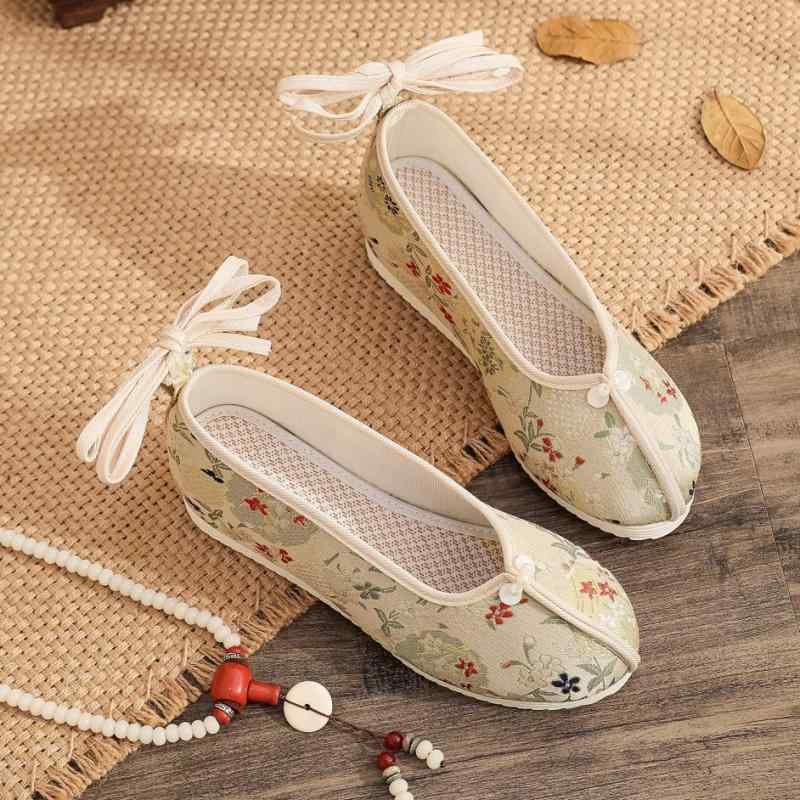 ダンスシューズ レディース 民族風布靴 刺繍 坡跟 インヒール ラウンドトゥ フラットシューズ 金糸緞 綿布 春夏秋 ベージュ ピンク