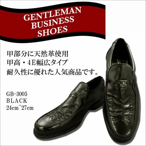 商品情報素材/材質アッパー素材:合成皮革×(甲部分本革使用)*屈曲の多い甲部分には本革を使用しています。底素材:合成サイズ24.0cm,24.5cm,25.0cm,25.5cm,26.0cm,26.5cm,27.0cm幅:4Eヒール高:約2.5cmカラーBLACK(ブラック)注意※モニター発色の具合により色合いが異なる場合がございます。※こちらは、メーカー直送品です。※他の商品との同梱発送出来ません。※「代金引換」お受付出来ない商品です。※北海道、沖縄、離島などは、追加送料(北海道+220円、沖縄/離島+3,135円)が発生いたします。※定期的に在庫確認をしていますが、注文のタイミングにより欠品の可能性があります。その際は、こちらでキャンセルいたします。定番アイテム GENTLEMAN BUSINESS SHOES 4E 幅広 甲高 シニア ビジネスシューズ GB-3001 おしゃれ フォーマル ビジネス カジュアル ビジカジ 誕生日 記念 プレゼント ギフト 送料無料 アダルト層に大人気!!定番アイテム ビジネスシューズ。 5つの特徴!!1. 幅広4Eタイプでゆったり2. 甲高設計により脱ぎ履きがスムーズ3. 柔らかい素材でソフトフィット4. 軽量タイプなので軽快な履き心地5. 屈曲の多い甲部分に本革を使用することで、履いた時のシワの違和感がなくなり耐久性が増します。冠婚葬祭・ビジネス・普段履きでも履ける人気のシューズです。 2