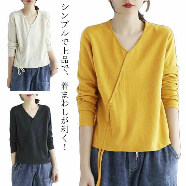 カットソー ロンT 透けない Tシャツ レディース 長袖 送料無料 vネック 無地tシャツ 紐付き 春 秋 シンプル おしゃれ 女性 ゆったり カジュアル 大きサイズ