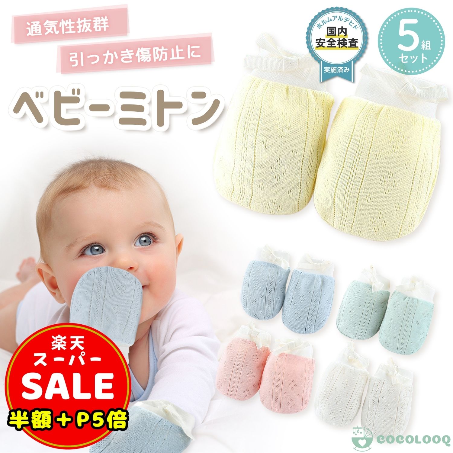 備考メーカー希望小売価格はメーカーサイトに基づいて掲載しています-商品詳細-〇サイズ Sサイズ:縦9.5cmx横7cm Mサイズ:縦10.5cmx横8cm 〇バリエーション 2種類 Sサイズ/Mサイズ 〇素材 ミトン部分:コットン100% 手首部分:コットン96%、スパンデックス4% 〇重量 1枚約10g 〇セット内容 5組セット 下記5色1組ずつ Sサイズ:グリーン、ブルー、ホワイト、ピンク、クリーム Mサイズ:グリーン、ブルー、ホワイト、ピンク、イエロー 〇お手入れ方法 洗濯可能(洗濯ネットに入れてお洗濯をおすすめします) 〇ご注意 ・リボン(ひも)部分などの誤飲にご注意ください。 ・ご使用のモニター環境により色味が異なる場合がございます。 ・海外製品の為、縫製方法が国内生産品と異なり、ほつれが見られる場合がございます。 ・寸法は個体により若干差異がある場合がございます。 【ベビーミトンとは】 赤ちゃんが自分のお肌を引っかいたりして傷つけないように 手に被せてトラブルから守るアイテムです。 かきむしり防止や指しゃぶり防止に役立ちます。 また、爪切りの負担軽減になります。 【やさしいコットン100%】 なめらかな肌触りのコットン素材です。 柔らかくお肌に優しい綿100%の天然素材で、赤ちゃんにもやさしいつくりになっています。 【通気性が良く快適】 体温調節が未熟な赤ちゃんにストレスの少ない 快適な着け心地となるよう、通気性の良い 可愛い透かし柄模様のコットン素材を使用しています。 【伸縮性とサイズ調整】 赤ちゃんが手遊びしたり寝返りをしても外れにくい設計です。 手首部分は伸縮性があり、付属のリボンを閉めることで きつさを調整出来ます。 ※リボンの誤飲にはご注意ください。 【いつも清潔5組セット】 汗をかいたとき、汚れたときなどすぐに取替えができる 5組セットの商品です。 洗濯機で洗えて、いつも清潔にご使用いただけます。 予備がたくさんあるのでお出かけ時にも便利です。 ■出産祝いにおすすめ! 優しいカラーリングの5色セットで赤ちゃんの成長に合わせた2サイズから選べます。 ベビーミトンは実用的で喜ばれやすく贈りやすい出産祝いです。 ■敏感肌の赤ちゃんに。 生まれたての赤ちゃんは肌が敏感なので、肌触りが良い快適な着け心地の 綿100%天然素材を使用しています。 ■かきむしり防止 引っかき傷や虫さされ時などのかきむしり行為の防止に役立ちます。 ミトンを付けてあげることで、赤ちゃんの爪のお手入れの頻度も軽減できます。 ■伸縮性 ストレスの少ない伸縮性のある素材を使用しており 程よい大きさで手の動きを妨げません。 リボン紐で手首の調節が出来ます。 ※リボン紐の誤飲にはご注意ください。 ■シンプルデザイン シンプルで可愛い透かし柄デザインとコーディネートに合わせやすい パステルカラーの見た目も可愛い組み合わせです。まとめ買いがお得!ご購入前にクーポンをゲット!赤ちゃんを優しくつつむ!おすすめ夜泣き対策おくるみ2選天然素材でお肌に優しい!ベビー&キッズファッションアイテム