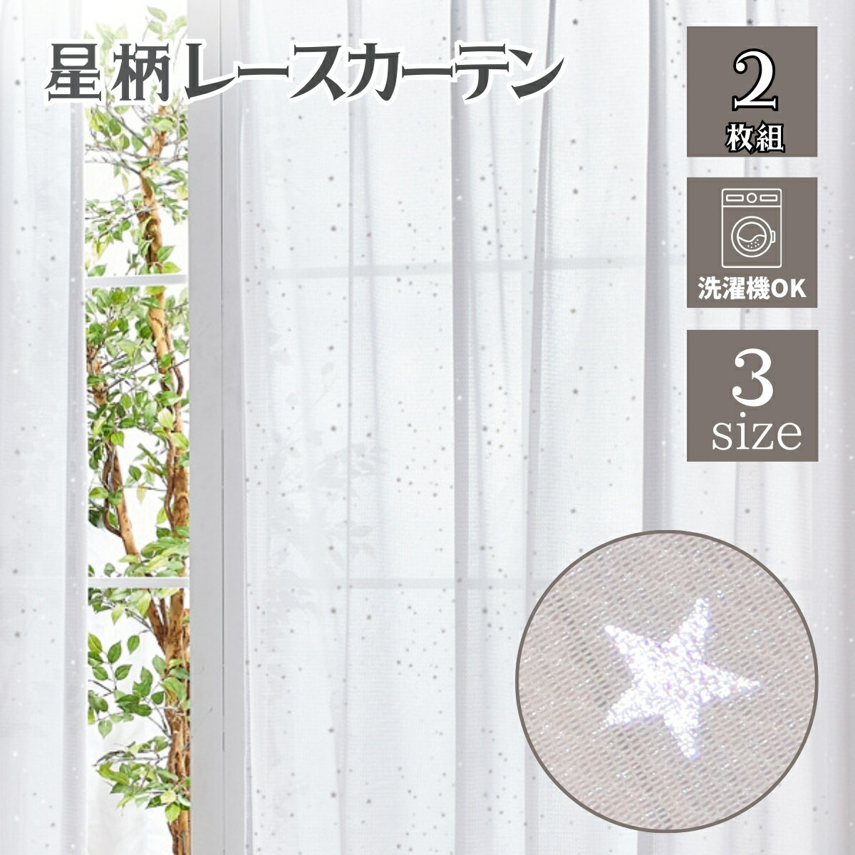 キラキラ 星柄 レース カーテン 3サイズ 2枚セット 幅100×丈133・176・198cm キラキラプリント 光 反射 きらめく 星空 箔 箔プリント フック付き ウォッシャブル UVカット 紫外線カット 洗える 採光 北欧 韓国インテリア おしゃれ プリント 【送料無料】 HZ-HAL-14