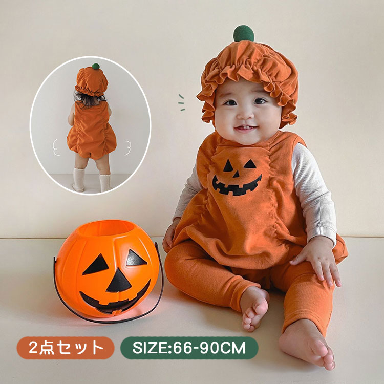Halloween ハロウィン 衣装 ベビー コスプレ かぼちゃ ロンパース 赤ちゃん ベビー服 子供 コスチューム 仮装 着ぐるみ 帽子セット 2点セット カバーオール 男の子 女の子 可愛い オレンジ ノースリーブ 変身 出産祝い プレゼント イベント