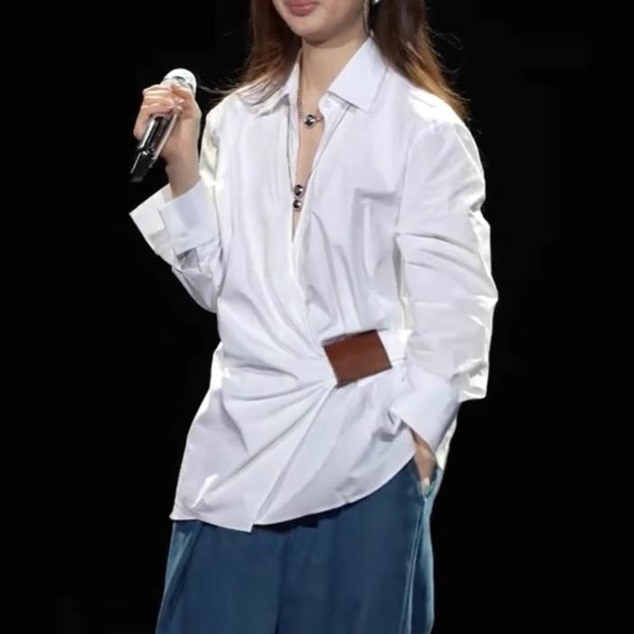シャツ レディース 秋冬 デザイン性 不規則性 ウエストマーク カジュアル トップス 長袖 ブラウス カットソー ギャザー 絞り・主な素材: 涤纶(聚酯纤维)・柄: 無地・スタイル: 無地・袖丈: 長袖・版型: レギュラー・着丈: 普通(50cm<着丈≤65cm)・ネックライン: 襟付き・袖のタイプ: レギュラー袖・流行の要素: 無地・カラー: ホワイト, グリーン, ブラック・サイズ: S, M, L, XL・スタイル: 日韓カジュアル・前立て: 隠しボタン・主な素材の含有量: 80%-90%・スタイル: カジュアル・越境スタイル: ストリート・製品カテゴリ: シャツ・主な素材成分2の含有量: 30%以下