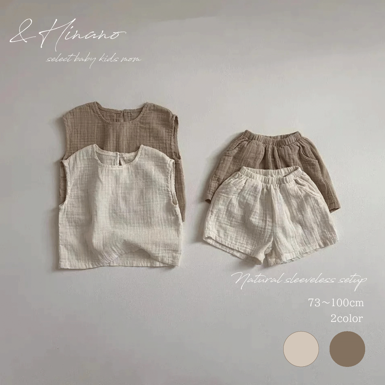 2カラー ベビー ノースリーブセットアップ 韓国子供服 73cm〜100cm 70 73 80 90 100 ナチュラル 男の子 女の子 短パン ショートパンツ ハーフパンツ ブラウス カットソー 上下セット 夏 コーデ サマー コーディネート ブラウン ベージュ 茶