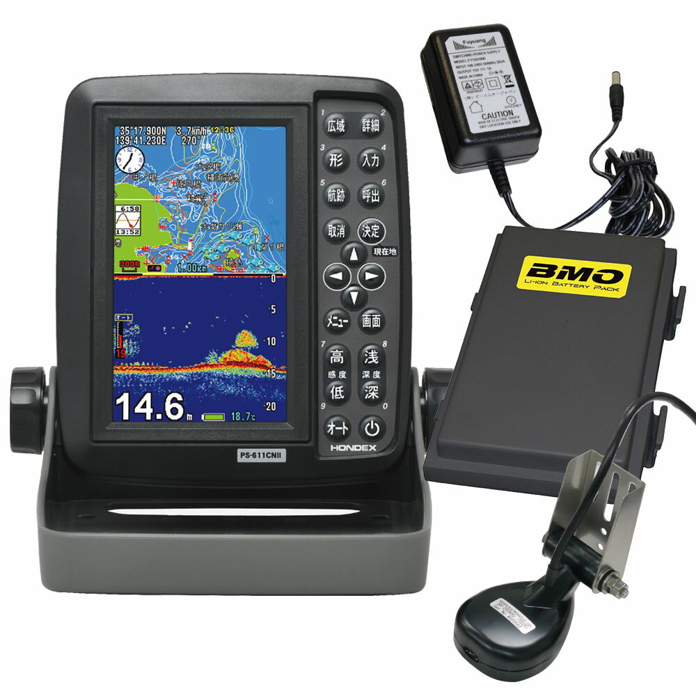ホンデックス PS-611CNII ディープ仕様 TD25振動子 BMOバッテリーセット GPSアンテナ内蔵 5型ワイド GPS 魚探 100W 50/200kHz 魚群探知機