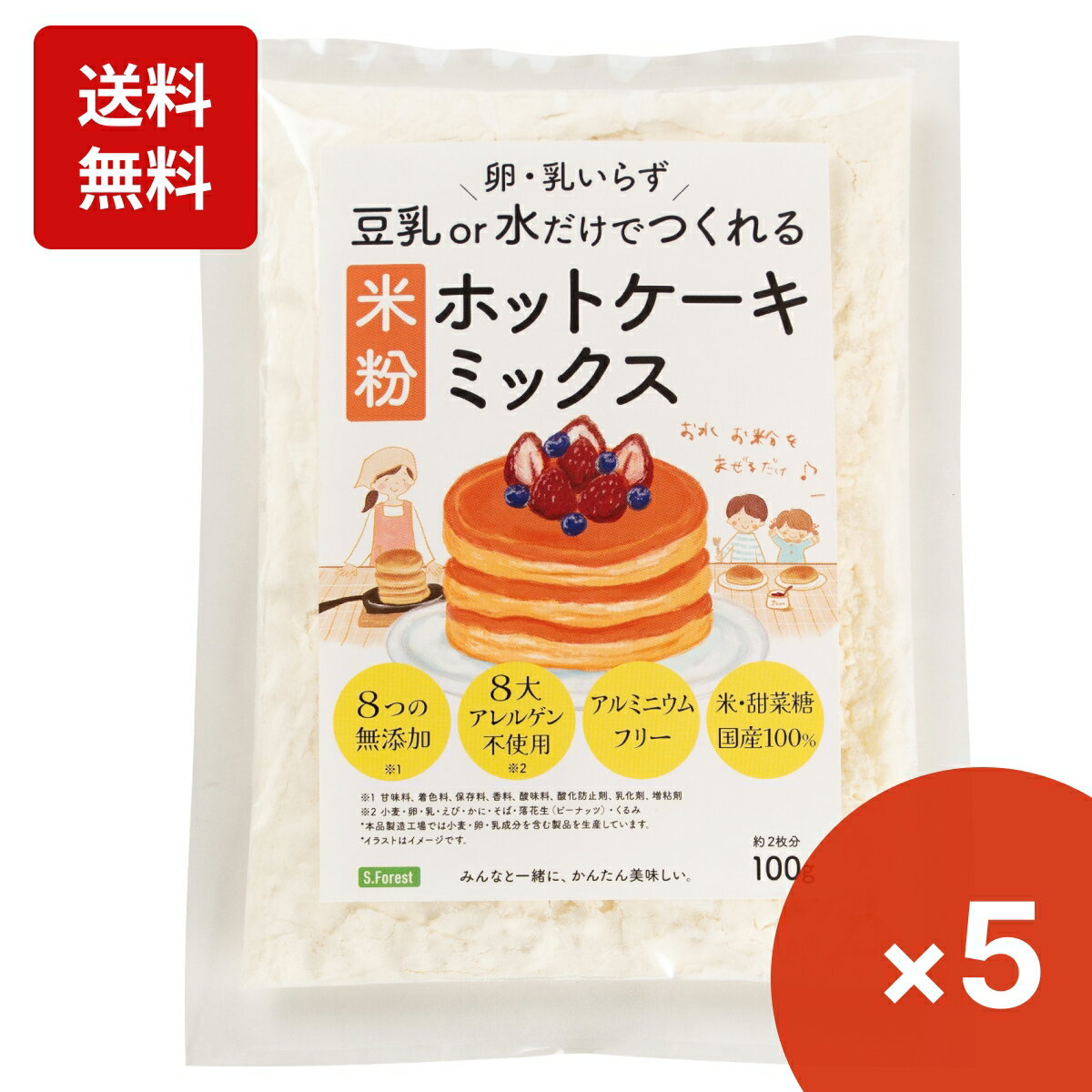 商品情報名称米粉のホットケーキミックス(パンケーキミックス)内容量100g×5袋原材料名米粉(国産)、てんさい糖(国産)、 とうもろこし粉、植物油脂、大豆粉、食塩、ベーキングパウダー(アルミニウムフリー)賞味期限別途商品ラベルに記載保存方法直射日光、高温多湿の場所を避けて保存してください。販売者S.Forest Garden(エスフォレストガーデン)この商品について小麦・卵・乳不使用。豆乳or水だけで作れる国産こめ粉100%のホットケーキミックスです。卵や牛乳なしで作れる、本当の意味での、8大アレルギー物質不使用の米粉パンケーキミックスです。(小麦、卵、乳、えび、かに、くるみ、そば、卵、乳、落花生(ピー ナッツ)不使用)代表的な8つの添加物不使用、国産米粉100%の無添加パンケーキミックスです。(甘味料・着色料・保存料・香料・酸味料・酸化防止剤・乳化剤・増粘剤不使用)グルテンフリー、アルミニウムフリー(硫酸アルミニウムカリウム(みょうばん)不使用)のベーキングパウダーを使用豆乳、水、卵+水、3種類の作り方で、風味・食感の異なるグルテンフリーのこめ粉ホットケーキをお楽しみ頂けます。赤ちゃんの離乳食後期(9ヶ月~12ヶ月)のつ手づかみ食べにもお試し頂けます。便利な1回使い切りサイズ(約2枚分)×5回分のセット内容です。内容量:100g×5個卵や乳製品をはじめとする動物性原材料を使用せず、豆乳or水だけで作れるため、ヴィーガンやベジタリアンのお菓子作り、アレルギー対応食品の非常食として備蓄にもおすすめです。注意事項本製品は、米粉を使用しておりますが、製造工場では小麦・卵・乳成分を含む製品を製造しています。アレルギーをお持ちの方は、かかりつけ医に相談のうえご使用ください。揚げ物料理にはお使いにならないでください。 生地が破裂して油が飛び散り、やけどする危険があります。 開封後は、吸湿・虫害を防ぐため、必ず袋口を密閉して冷蔵庫で保存し、 お早めにご使用ください。関連ワード米粉 ホットケーキミックス パンケーキミックス こめ粉 アレルギー対応 無添加 グルテンフリー アルミニウムフリー アレルギーフリー 離乳食 離乳食後期(9ヵ月~)日本製 国産 添加物添加物不使用 8大アレルギー物質不使用 小麦卵乳不使用 水だけで作れる栄養成分表示栄養成分表示(100gあたり)・エネルギー:388kcal・たん白質:5.2g・脂質:5.1g・炭水化物:78.0g・食塩相当量:1.78g※この表示値は目安ですS.Forest 8大アレルギー物質不使用&8つの無添加 国産米粉のホットケーキミックス 100g×5個 グルテンフリー パンケーキミックス こめ粉 赤ちゃん 離乳食後期(9ヶ月~12ヶ月) アレルギー対応食品(小麦・卵・乳アレルギー)非常食として備蓄にオススメ 小麦・卵・乳不使用 水だけで作れる国産米粉100%使用の8つの無添加&グルテンフリーのホットケーキミックス・パンケーキミックス 5