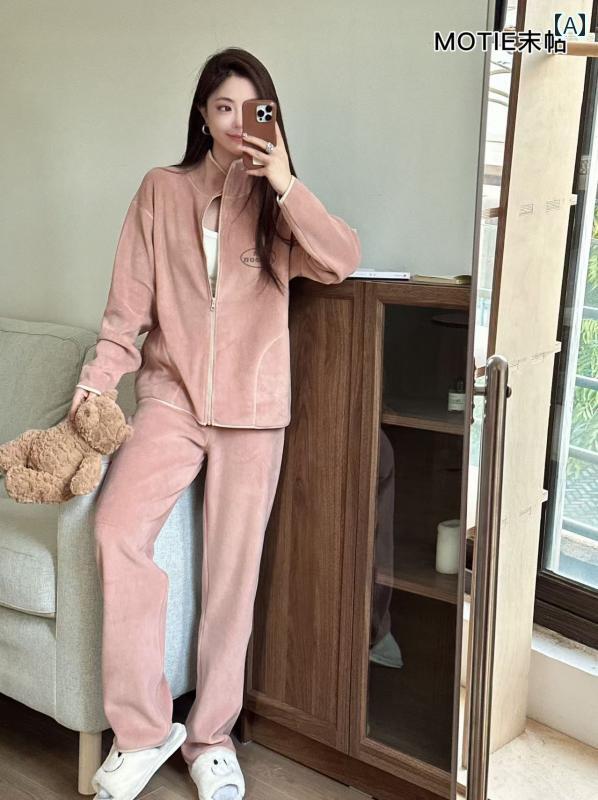 スタンドカラー オーストラリア ベルベット カップル ホーム 服 23 秋冬 ジッパー スタイル ヘミング 裏起毛 厚手 暖かい パジャマ セット