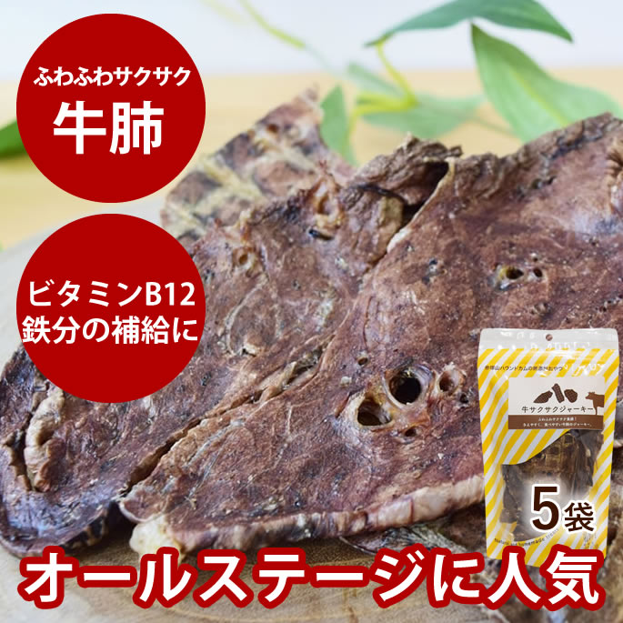 ※1 常温品と冷凍品混在時は11000円以上で送料無料 ※2 沖縄・北海道は11000円以上で通常送料無料、常温混在時は22000円以上で送料無料となります。 ※3 ただし在庫有りの商品に限る。土曜日は12時までとなります。 ※4 定休日:日曜日・第1第3土曜日・祝日となります。 ■お支払方法や送料設定について ■購入後も安心の返品・交換について ■商品配送のお届け目安について ■会社概要 牛サクサクジャーキー ふわふわサクサクで手で簡単に割ることができます。 栄養が豊富でオールステージに人気です。 硬くないのでシニア犬にもおすすめです。 ■内容量 50g×5袋 ■原材料 牛肺 ■原産国 日本 ■保証分析値 粗タンパク質71.02%以上、粗脂肪16.04%以上、粗繊維4.12%以下、粗灰分4.22%以下、水分5.71%以下 ※この表示値は、目安です ■カロリー 385kcal/100g ※この表示値は、目安です ■保存方法 ★直射日光、高温多湿を避けて冷暗所で保管してください。無添加の商品ですので、開封後はお早めにお召し上がりください。 ★おやつはフードのかわりにはなりません。副食としてお使い下さい。 ★おやつの与えすぎは肥満の原因になります。与えすぎにご注意下さい。 ■配送方法 ヤマト運輸 ■送料について のみ → 5500円以上送料無料 のみ → 5500円以上送料無料 +同時注文 → 11000円以上送料無料 冷凍商品と常温商品の同梱は出来ません。 送料表の常温品+冷凍品の料金をご参照ください。 ※金額変更の場合がございます。 冷凍同時注文の際や、沖縄北海道一部離島は追加送料など、ご注文後に金額修正をする場合がございます。 詳しくは【送料について】をご一読くださいませ。商品の特長 与え方 商品スペック 牛サクサクジャーキーの特長 ふわふわサクサク 手で簡単に割ることができます。 硬くないのでシニア犬にもおすすめです。 ビタミンB12や鉄分の補給に ビタミンB12は植物性の食品には含まれていないため、豚肉や鶏肉と比べてビタミンB12の含有量が多い牛肉での摂取がおすすめです。 美味しさも栄養もたっぷりのおやつを愛犬に! 与え方 手で割れて与えやすい 手で簡単に割れる硬さなので、口の小さな愛犬にも割って与えられます。 普段のおやつや、トレーニングのご褒美にもおすすめです。 大きさにバラつきがあります 天然素材のため大きさにはバラつきがございます。 大きい場合は手でちぎって小さくして与えてください。 縦:約5~16cm、幅:約6〜7cm 1袋999円(税込) 5袋セット4,801円(税込) 10+1袋セット10,000円(税込)
