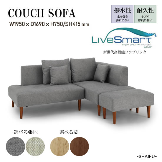 【送料無料】カウチソファ L/R 幅195cm SHAIFU シャイフ ファブリック L型ソファ 選べる張地 選べる脚色 グレー フェザー Sバネ 木脚 ナチュラル ブラウン 高機能ファブリック ライブスマート スタイリッシュ モダン シンプル 北欧 おしゃれ 人気 サンキ