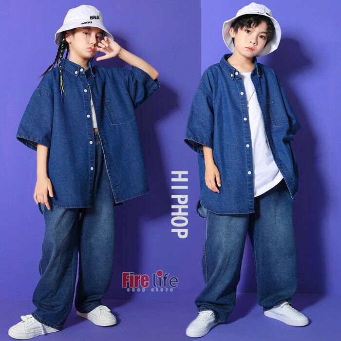 キッズダンス衣装 ヒップホップ デニムシャツ デニムパンツ 袖なしTシャツ ホワイト hiphip 演出 イベント ダンス大会 デニム