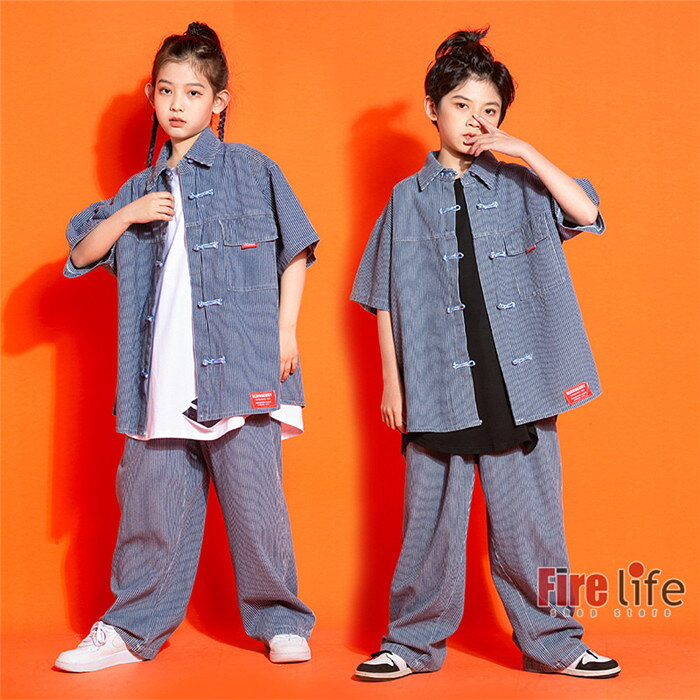 キッズダンス衣装 ヒップホップ デニムシャツ デニムパンツ 袖なしTシャツ 縦縞 チャイナ風 太極拳 hiphip 武術 舞台 演出 イベント