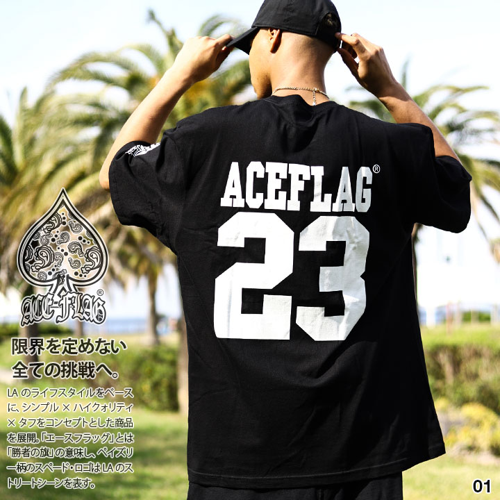 ACEFLAG Tシャツ 半袖 メンズ レディース 黒 白 大きいサイズ ビッグシルエット エースフラッグ おしゃれ かっこいい 袖ロゴ スペード ペイズリー バンダナ柄 ナンバー 23 b系 ヒップホップ ファッション AF-TS-TS-009