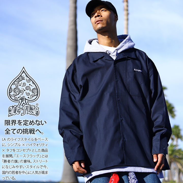 【ブラックフライデー】ACEFLAG 長袖シャツ メンズ レディース 春秋冬用 全4色 大きいサイズ エースフラッグ 開襟シャツ シンプル Compton コンプトン 刺繍 胸ポケット b系 ヒップホップ ファッション ストリート系 ブランド 服 AF-TL-LS-001