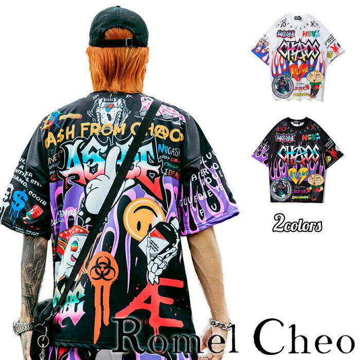 RomelCheo 落書き ロゴ 半袖 tシャツ メンズ イラスト プリント 総柄 ストリート系 カジュアル ヒップホップ hiphop 服 個性的 個性派 派手 原宿系 ファッション 綿 スポーツミックス ロメルチェオ