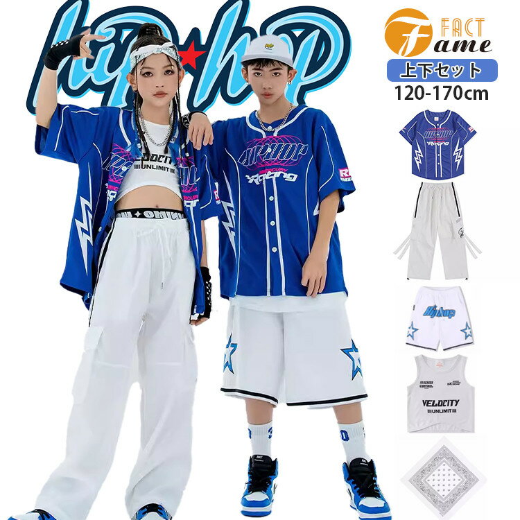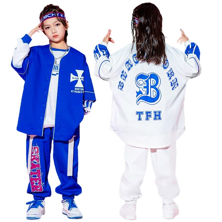 キッズ ダンス 衣装 ベースボールシャツ パンツ 白 青 ヒップホップ 衣装 キッズ k-pop ダンス 衣装 シャツ 7分袖 パンツ ズボン 練習着 ストリート系