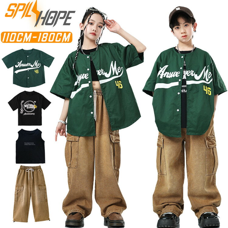 緑 ベースボールシャツ キッズ ダンス衣装 セットアップ おしゃれ ジャケット 半袖 シャツ トップス カーゴパンツ デニムパンツ 女の子 男の子 かっこいい かわいい ゆったり タンクトップ ヒップホップ ジャズダンス 韓国 k-pop jazz 演出服 練習着 団体服 発表会 個性派