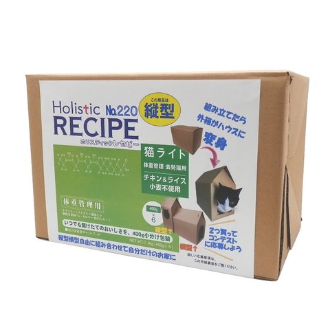 2.4kgは外箱を組み立てることでネコちゃんのハウスとしてご利用いただけます。 また、複数の外箱を組み合わせることで自分だけのお家を作ることも可能となっております。 商品説明 フード100gあたり、1100億個以上の乳酸菌配合 ホリスティックレセピーは、愛猫が毎日健康で元気に過ごすために必要な成分は勿論、泌尿器系障害や毛玉・整腸・抗酸化作用・免疫力・便臭・皮膚・被毛などを多角的に考えて作られています。 ホリスティックレセピーは、愛猫の健康維持にバランスのとれた栄養を与えられるというAAFCO(米国飼料検査官協会)の必要栄養所要量の基準を満たしています。 尿結石に配慮: マグネシウムを制限しています 毛玉(ヘアーボール)に配慮: 異なる繊維質を豊富に配合することで毛玉(ヘアボール)に配慮しています 免疫力維持: 毎日与える食事だからこそ合成保存料・合成着色料・人工香料を使用せず、バランスのとれた栄養を摂ることで健康を維持し本来持っている免疫力を保ちます おなかの健康維持: 醸造酵母と消化吸収速度の違う数種類の炭水化物を使用することにより、腸内でゆるやかに吸収され胃腸の健康を保ちます 皮膚・毛艶: 原材料のひまわり油には摂取しにくいオメガ3脂肪酸多く含まれています。このオメガ3脂肪酸が皮膚と毛艶を健康に保ちます キレート化ミネラル: 単体では吸収しにくいミネラルを、アミノ酸で包み込むことでミネラルの吸収性を高めています 原材料: 鶏肉、鶏肉粉、米、豆粉、鶏脂、乾燥卵製品、豆タンパク、ポテトタンパク、ツナミール、ナチュラルフレーバー、酵母エキス、ひまわり油、アルファルファミール、ビートパルプ、オーツ麦繊維、トマト粗、醸造酵母、亜麻仁、クランベリーパウダー、チコリエキス、ユッカフォーム抽出物、アカシア食物繊維、乳酸菌末(殺菌乳酸菌、デキストリン)、塩化カリウム、塩化ナトリウム、リン酸、DL-メチオニン、タウリン、アスコルビン酸、イノシトール、塩化コリン、ミネラル類(アミノ酸キレート化鉄、アミノ酸キレート化亜鉛、アミノ酸キレート化銅、アミノ酸キレート化マンガン、アミノ酸キレート化コバルト、鉄、亜鉛、炭酸カルシウム、銅、マンガン、セレン、ヨウ素、コバルト)、ビタミン類(A、D3、E、ナイアシン、パントテン酸、B1、B2、B6、葉酸、ビオチン、B12)、サッカロマイセス・セレビシエ、ラクトバチルス・アシドフィルス、エンテロコッカスフェシウム、アスペルギルス・ニガー、バチルス・サブチルス、酸化防止剤(ミックストコフェロール、クエン酸、ローズマリーエキス) 成分: たんぱく質:32.0%以上 脂質:19.0%以上 粗繊維:5.00%以下 粗灰分:8.00%以下 水分:10.00%以下 マグネシウム:0.10%以下 カルシウム:1.00%以上 リン:0.80%以上 タウリン:0.18以上 代謝エネルギー:365kcal/100g 原産国: 米国 発売元: 株式会社パーパス