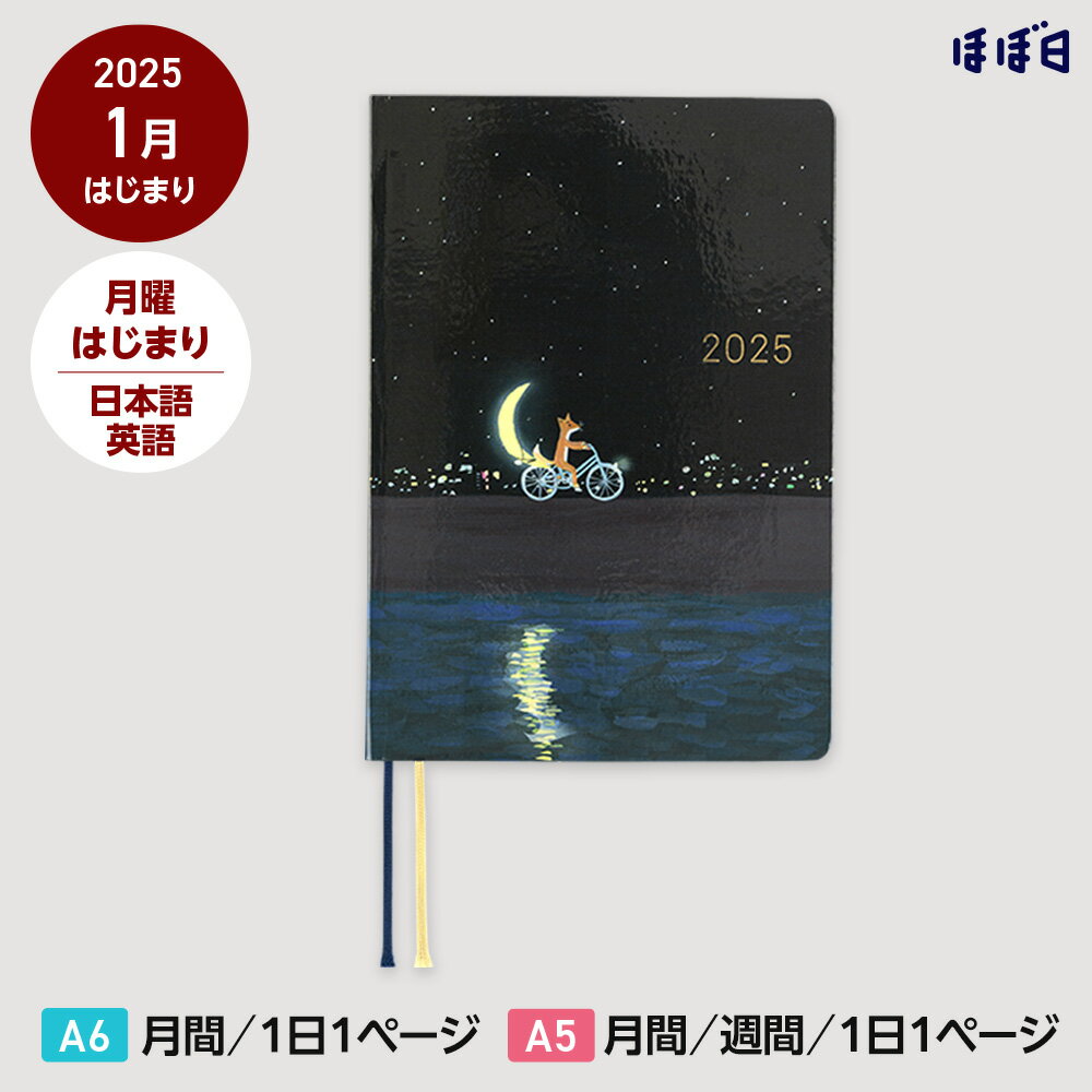 こちらは2025年はじまりの商品です。2026年はじまりの商品ではありません。 2025年はじまりの手帳はこちら 「使ったことないけど、ためしたい」かたはもちろん、 「使っているけど、家族や友人にもおすすめしたい」というかたに、 ぜひほぼ日手帳をおためしいただけたらと、 約60%OFFの特別価格にて販売します。 つかってみてくださいね。 久保田寛子 / 三日月配達 [HON/A6・A5/1日1ページ/日本語版・英語版/1月/月曜はじまり] 星がまたたく夜、 海沿いの道を自転車で走るきつね。 水色の自転車の荷台にくくりつけてあるのは、 どうやら三日月のようです。 誰かのもとへ、 三日月を届けに行く途中でしょうか。 まるで絵本の表紙のように 想像がどこまでも広がるこの絵は、 イラストレーターの久保田寛子さんが 「HON」のために描き下ろしてくれたもの。 裏側には、 街灯の下のポストに 手紙を投函しにきた、ねこの姿が。 ねこの視線は、道の先のきつねに 向けられたものでしょうか。 きつねやねこの表情、 星空、遠くの街あかり、 三日月や街灯の光を映す水面。 いちばんしっくりくるバランスを考え、 久保田さんといっしょに 何度も微調整を繰り返しました。 「2025」の文字は、 控えめに光る金の箔押しで表現しています。 あなただけの物語のような日々が、 この手帳に綴られますように。 ■広いスペースがうれしい「1日1ページ」 使い方の幅が広がる、1日1ページの自由なスペースが特長です。 毎日のスケジュールはもちろん、 その日起こったできごとや感じたことを文字や絵で書き残したり、 思い出のチケットやシールなどを貼ったりと、自由に使えるたのしさがあります。 ■手帳にぴったりの「丈夫で使いやすい仕様」 軽くて丈夫、そして書き心地のよい、「トモエリバー」という紙を使用しています、 また、手で押さえなくてもパタンと180度ひらく、書きやすい設計になっています。 ■読みものとしてもたのしめる「日々の言葉」 毎日更新されている「ほぼ日刊イトイ新聞」のコンテンツから選んだ、 読んでたのしい言葉、うれしい言葉が ページの下に1日ひとつずつ掲載されています。 くすっと笑えたり、ちょっとした気づきがあったりする、 たのしい小さな読みものです。 製本は「ほぼ日手帳オリジナル」または「ほぼ日手帳カズン」と同様に、180度パタンと開いたまま使える「糸かがり製本」という綴じ方を採用しています。 手で押さえなくてもフラットな状態を保てます。 本体にはうすくて軽く、丈夫な手帳専用紙「トモエリバー」を使用しています。2024年版でリニューアルしたこの用紙は、より裏抜けがしにくく、同じ厚みでもより軽く、紙の繊維を整えて表面をよりスッキリと改良させた新しい手帳専用紙になりました。 巻末にはおまけページとして「まねして描けるスケジュールアイコン」「書くのがたのしみになる日記」「47都道府県のおすすめ麺リスト」が新たに追加となりました。 「HON」だけの特典として、オリジナルの下敷きがセットでついてきます。 A6またはA5サイズの透明な下敷きに5mm方眼をプリントしたデザインです。1mm刻みの目盛りもついているので、定規代わりとしても使えます。 ボールペンのクリップ部分を差すペンホルダーがついた下敷きで、「HON」とボールペンをいっしょに持ち歩けます。 「ほぼ日手帳2025」のHONには日本語版と英語版があります。お好きな言語をお選びいただけます。 ※HONは日本語版・英語版ともに1月はじまりのみとなります。 知っておいてほしいこと ■万年筆などをご使用になる場合は試し書きをおすすめします ほぼ日手帳で使用している「トモエリバー(手帳用)」の紙は、裏うつりしにくいことが特長です。 ただし、万年筆や水性インクのペンをお使いの場合や、状況によってはにじみや裏うつりが出たり、乾きにくいことがあります。 あたらしいペンを使う場合は、あらかじめ目立たない場所で試し書きをすることをおすすめします。 ■素材の特性・デザイン上、表、裏表紙の端や、角が若干白くなります 素材の特性・デザイン上、表、裏表紙の端や、角が若干白くなります。作業工程上避けられないものですのであらかじめご了承ください。 ■付属の下敷きについて 下敷きのペンフックは、ペンのクリップ部分を差し込んで使用ください。 ■クリアカバーのご使用はおすすめしません 表紙の特性上、クリアカバーのご使用はおすすめしません。無理に装着すると、手帳、クリアカバーの破損の恐れがございますのでご注意ください。 ■製造上、擦れ傷が目立つ場合があります。 製造上、表紙の製造工程や製本工程でどうしても擦れ傷が発生してしまい、特に濃色の製品は、より目立つ場合があります。あらかじめご了承ください。 ■ほぼ日手帳カバー、カバー・オン・カバーは使用できません。 厚みや硬さがありますので手帳カバーは使用できません。 無理な装着は破損の可能性がありますのでおやめください。 また、HONに直接カ