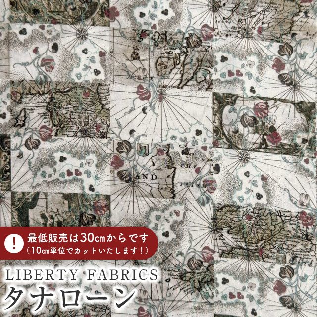 ★2025年SSコレクション★●素材:綿100%●生地幅:約110cm【生地の特徴】世界中の息を呑むような美しさを探求し、その一つ一つの冒険を忘れられないストーリーへと変えた「ボタニカル・エスケープ」コレクション。私たちと一緒にリバティの究極の休暇旅行に出かけましょう。上品な艶とやわらかな肌ざわりが特徴のリバティ・ファブリックスのタナローン。織の密度が高く、しなやかで豊かなドレープ性があります。ブラウスやワンピース、スカートなどの衣類の他、小物やインテリアなど幅広くお使いいただけます。Honeymoon Map(ハネムーン・マップ)リバティのアーカイブから集めたデザインを融合して作られた「ハネムーン・マップ」は、花柄やカンバセーショナルな要素、幾何学的なパターンが組み合わさったデザインです。伝統に根ざしたこのデザインは、1650年の「ブリタニア地図」の断片を取り入れ、古代の英国の王国を花のイラストやコンパス、雲、そして精巧な天体のモチーフとともに描いています。【ご注文前に必ずお読み下さい】・表示価格は10cmの価格です。・生地は30cmから10cm単位で販売しております。(30cmご希望の場合は、数量「3」と入力して下さい。 例:数量「10」=生地幅×長さ1m)・ご覧になるディスプレイ環境などにより、商品画像と実物の色味が異なる場合があります。・生産ロットにより、色味や風合いが変わる場合があります。幅につきましても若干差が生じる場合があります。予めご了承くださいませ。・当社の他オンラインショップと在庫を共有しており、注文が確定しても完売・欠品の場合があります。予めご了承下さい。・生地はカットしてご用意するため、注文キャンセル・数量変更・返品がお受けできません。【追跡可能メール便について】メール便は対応可能商品の【合計数量:20まで】承ります。※商品ページに〔メール便対応商品〕と表記のあるもののみ対応可能です。楽天市場のシステム上、メール便対応可能数量を越える場合でもメール便が選択できるようになっております。メール便対応数量を超えたご注文につきましては、ご注文受付及び商品手配を保留させていただきます。※宅配便をご希望の場合や、メール便対応可能数量を越える場合は、配送方法を【宅配便(佐川急便)】にご変更ください。※商品画像に掲載しております、メール便に関するご説明事項を必ずご確認ください。