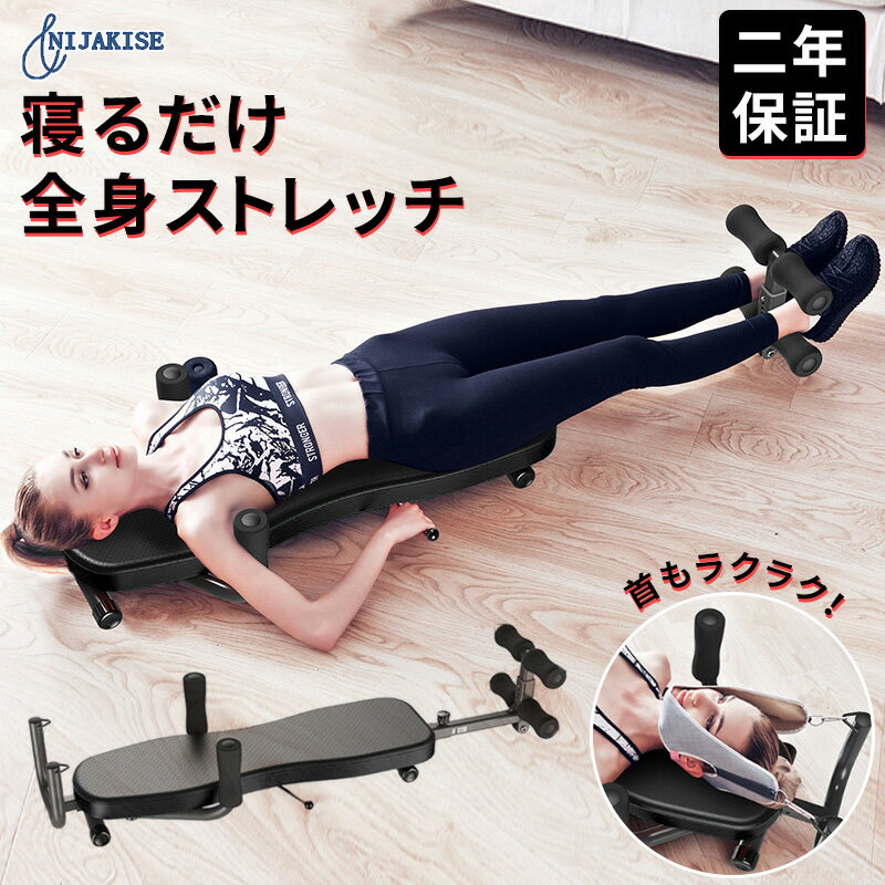 ・毎日の継続が重要!!!Nijakise、背骨や腰、膝など均等なけん引によるストレッチをする事で、猫背や背骨の歪み、前傾姿勢や傾斜姿勢の改善にも効果的です。 使いやすさなどが良くなっただけではなく、機能性や操作性も向上しており、けん引長は最大約16cmにもなります。 シート部の高さはわずか11cm、重量もわずか8.8kgと軽量で、持ち運びや収納もラクラク。身長190cmまで対応。 ・本体ボードの上に寝て、全身をけん引するストレッチャー。気持ちよく背筋が伸びてスッキリした正しい姿勢に。猫背、体が硬くて疲れやすいお悩みはストレッチで筋肉の緊張を和らげることでケアができます。本体に乗ってジャッキレバーを動かすだけで簡単に全身の筋肉を伸ばすことが出来ます。 ・梱包 サイズ:約W115×D33.5×H15cm 重量: 約10kg ※組立式 ※このマシンは家庭用です。 ※対応身長150~190cm 材質:スチール、PVC、綿ほか■組み立て式■付属品:専用スパナ、六角レンチ、取扱説明書■保証期間:2年 ・使い方は簡単。伸縮ポールを身長に合わせて調整してからシートに横になって脇と足を固定してハンドルを前後に動かすだけ。ご自身のペースで動かせるので若い方からご年配の方まで安心してお使いいただけます。 ・手軽に無理なく全身を伸ばせるストレッチャー。グイ~ンとした爽快感を体感したい方、姿勢や猫背が気になる方、成長期のお子さんに。自分でレバー操作するので安心です。爽快感とリフレッシュで気持ちと身体がスッキリ! 5cm刻みで9段階の調節が可能です。