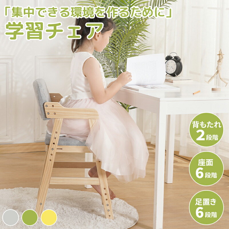 【成長に合わせて高さを調節できる学習チェア】サイズ:幅46×奥行44×高さ78cm / 座板高:約36~52cm / 足置き板高:約10~22cm (木商品につき多少サイズに誤差が生じます。)座面と足置きの段階調節機能が正しい姿勢をサポートし、集中力が続きます。ダイニングの食事兼リビング学習椅子にぴったりのキッズチェアです。大人のダイニングチェアと並べて置いても違和感がないシンプルなデザイン。 【高さ調整可能】座面6段階高さ調節。身長や体形などに合わせて、快適で使いやすい高さでお使いいただけます。足置き6段階高さ調節。地面に足がつかなくて、ブラブラさせたり姿勢が悪くならないように、足をしっかりと支えます。 【高品質のクッション】クッションの外は肌にやさしいテクノファブリックスの材質で、とても快適で通気性がよく、ファスナー式なので、汚れても洗えます。座布団の中は弾力性のあるスポンジで、硬くて適度で、長く座っても凹みにくいです。 【シンプルな設計】全ての角を丸く加工しているので、手触りも優しく、万一ぶつかっても安心です。耐荷重も約100kgと大人も腰掛けられる耐久性です。材料はラバーウッドを採用し、荷重力が強く、安定して揺れにくく、お手入れは簡単で、干し布を拭くだけできれいになります。耐久の木の構造だから、堅牢で持続可能です。 【お客様にて組み立て】※こちらの商品はお客様組み立て品となります。※商品は、モニターによって色合いが異なって見える場合があります。 ※組立方によっては、完成した商品サイズに多少の誤差が発生する場合がございます。